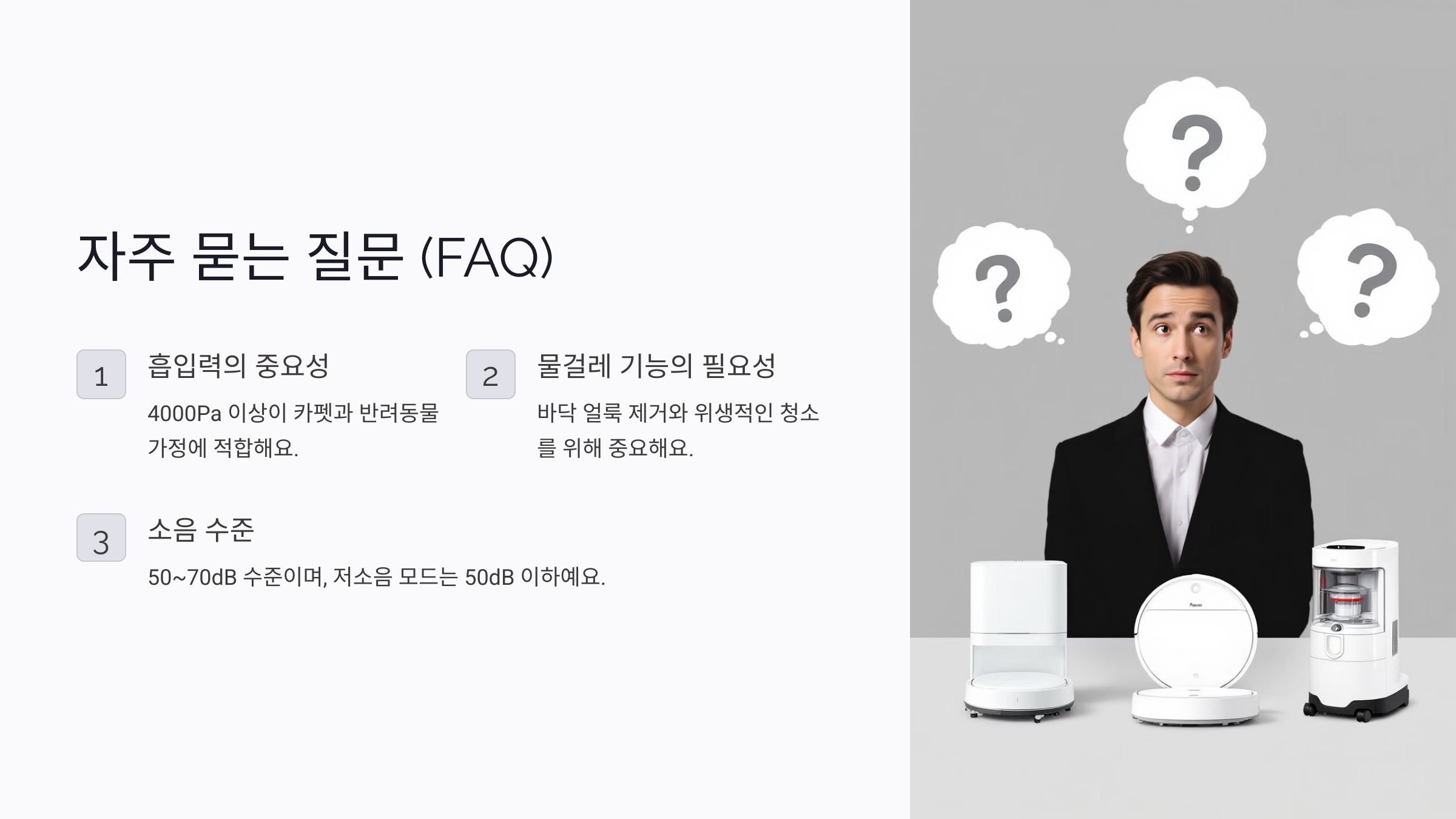 A1. 흡입력은 먼지와 큰 입자를 제거하는 데 핵심적인 요소예요. 카펫이나 반려동물이 있는 가정에서는 4000Pa 이상의 흡입력을 갖춘 모델이 적합해요.