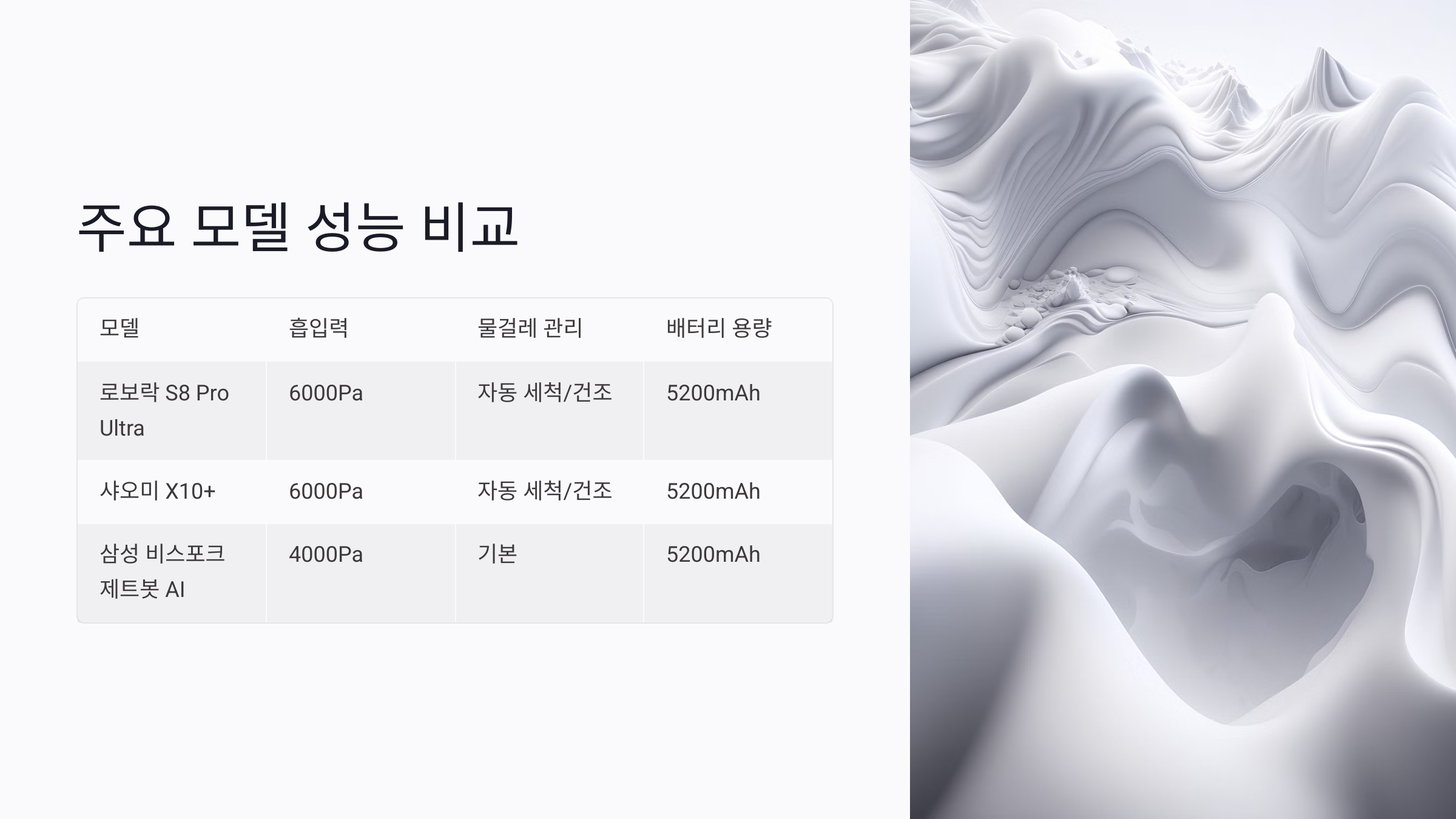 - 자동 세척 및 건조: 로보락 S8 Pro Ultra, 샤오미 X10+, 에코백스 디봇 T10+