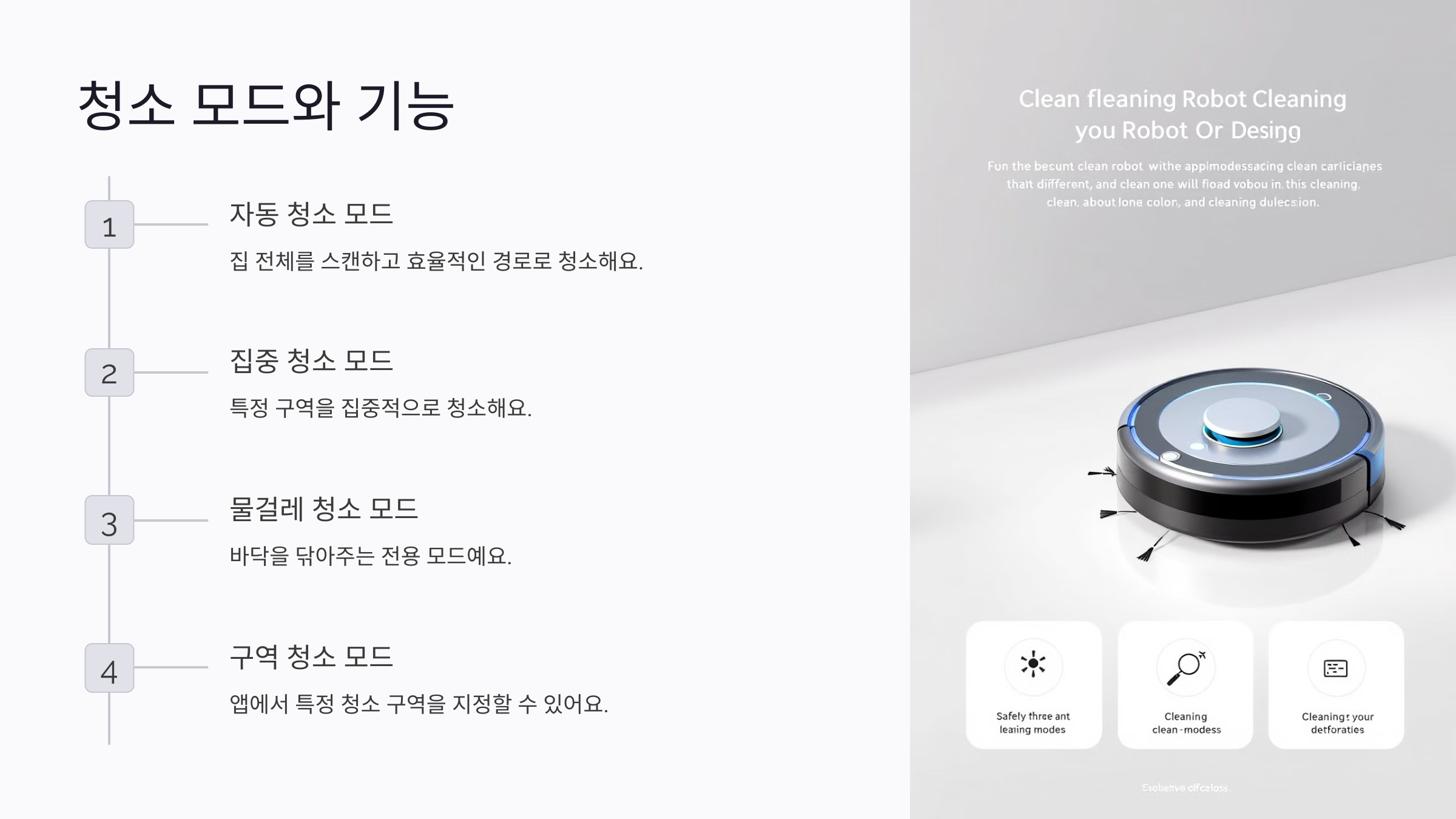 1. 자동 청소 모드: 로봇청소기가 집 전체를 스캔하고, 효율적인 경로를 설정해 자동으로 청소를 진행해요. 대부분의 모델이 이 모드를 기본으로 지원합니다.