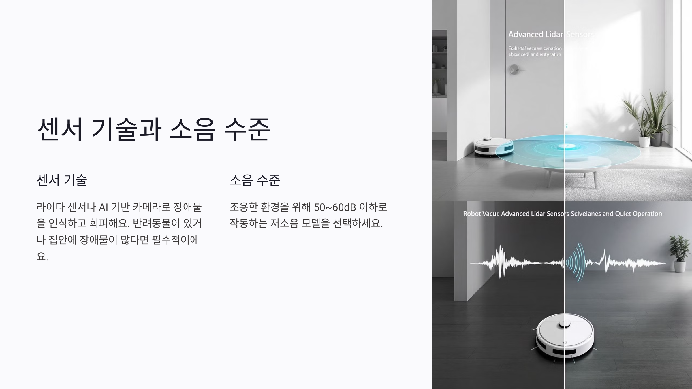 4. 센서 기술: 최신 로봇청소기는 라이다 센서나 AI 기반 카메라를 탑재해 장애물을 인식하고 회피하는 기능을 지원해요. 반려동물이 있거나 집안에 장애물이 많다면 이 기능이 필수적이에요.
