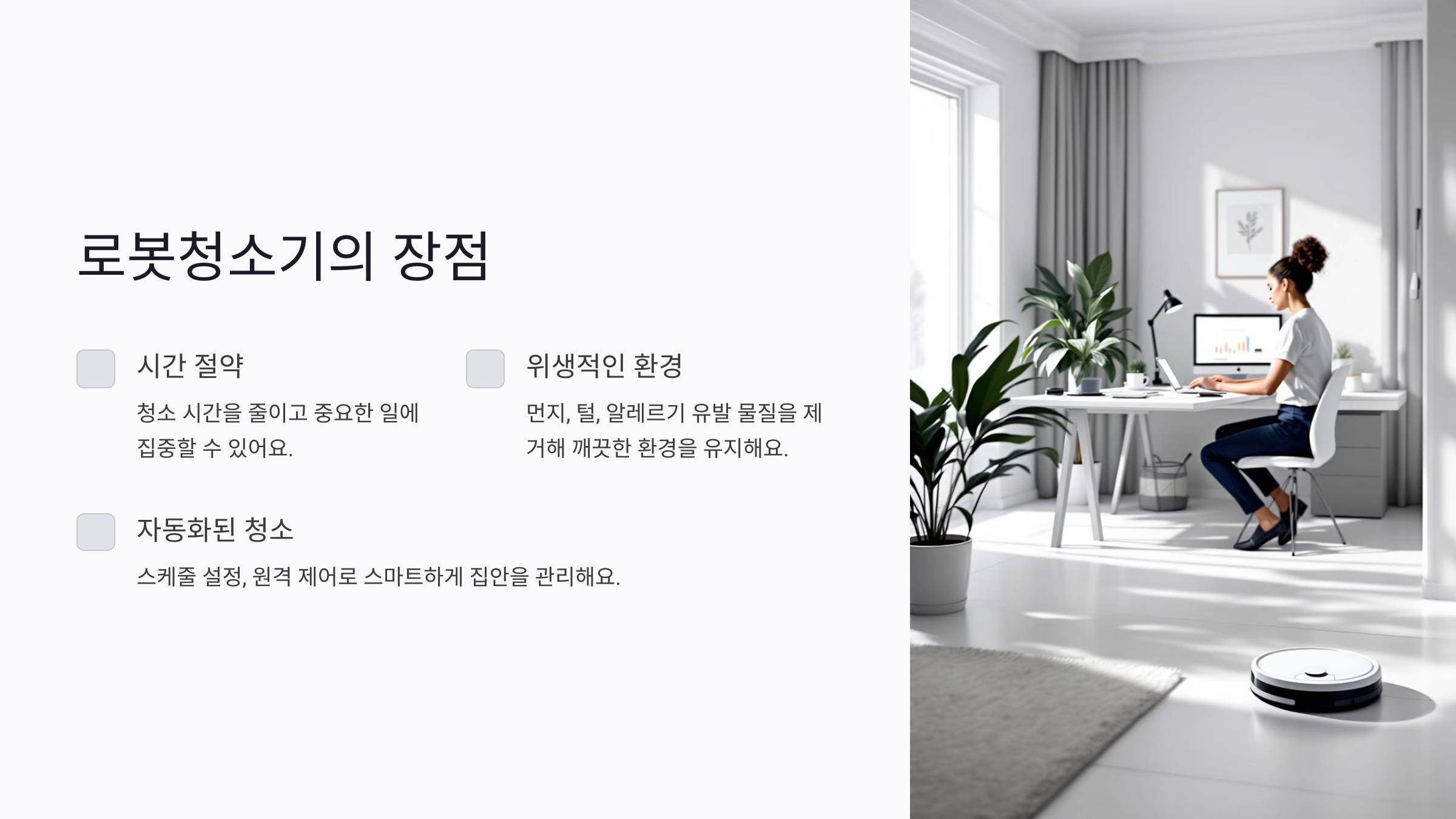 1. 시간 절약: 집 청소에 드는 시간을 줄이고, 다른 중요한 일에 집중할 수 있도록 도와줘요. 특히 바쁜 직장인이나 육아 중인 가정에서 큰 도움을 줘요.