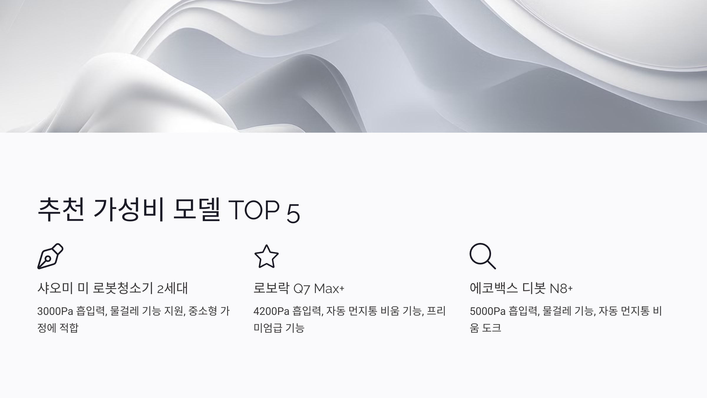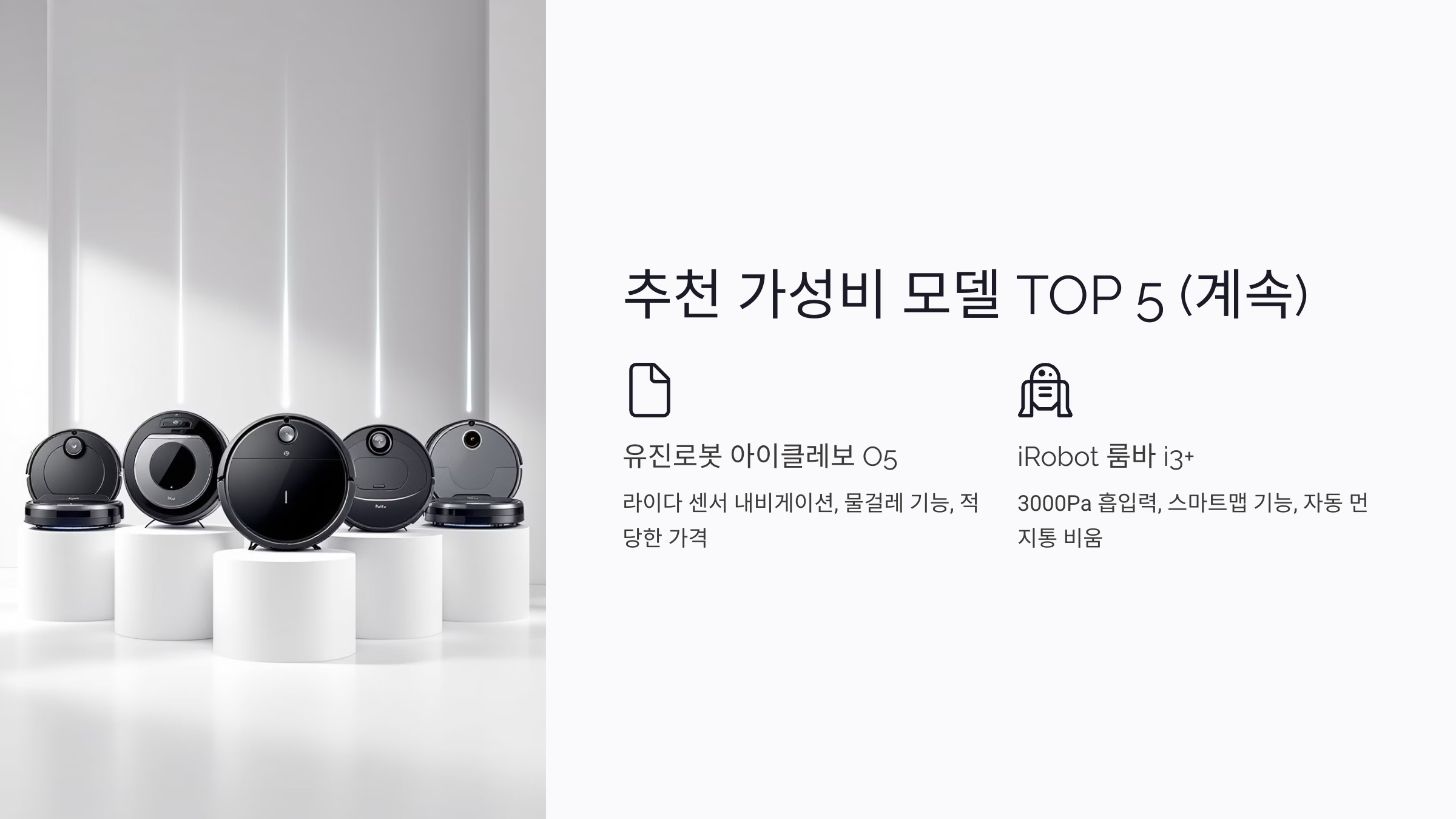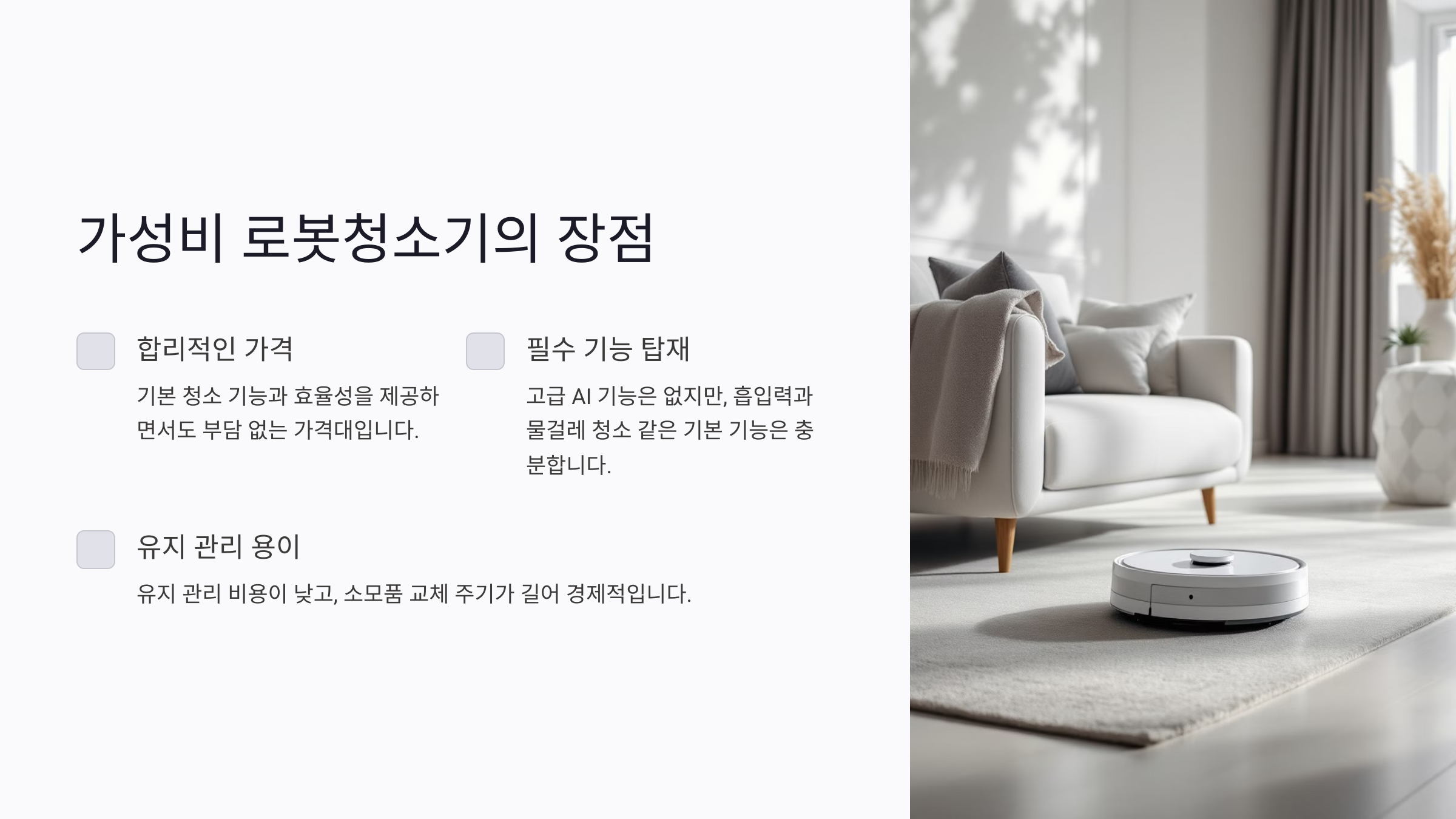 로봇청소기를 처음 사용하는 입문자나 예산을 고려하는 사용자라면, 고가 모델 대신 가성비 좋은 제품을 선택하는 것이 현명한 선택이에요. 가성비 모델은 아래와 같은 장점을 제공해요: