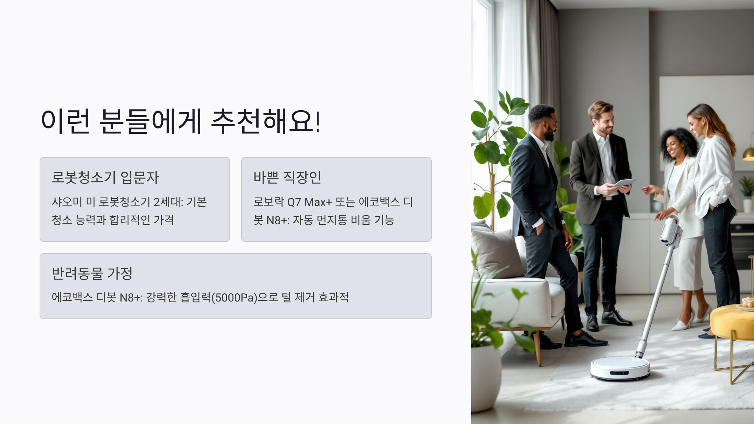 가성비 좋은 로봇청소기는 아래와 같은 분들에게 특히 추천드려요: