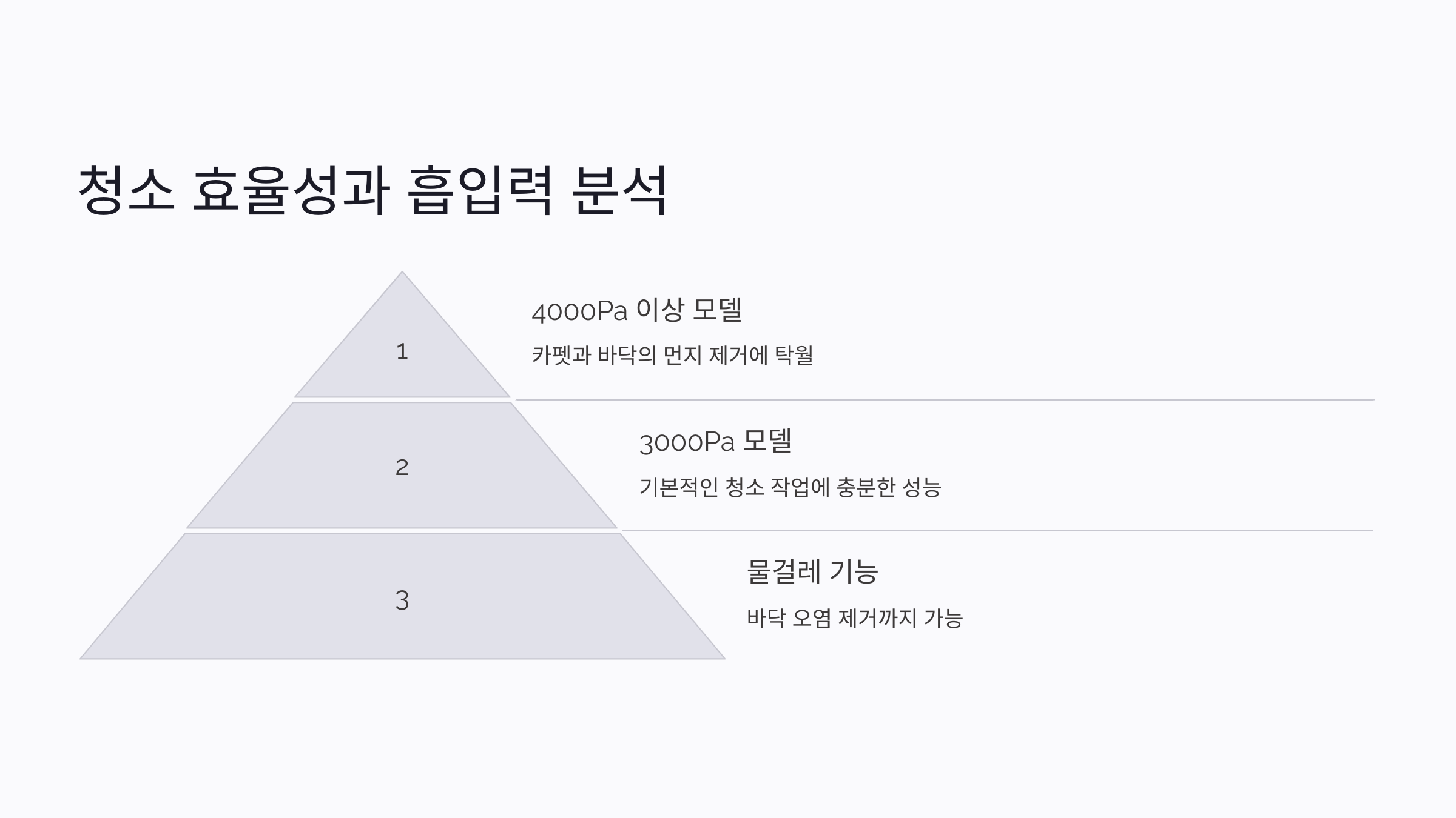 A6. 흡입력이 강할수록 먼지와 큰 입자를 더 효과적으로 제거할 수 있어요. 카펫 청소나 반려동물 털 제거를 위해서는 4000Pa 이상의 모델이 적합해요.