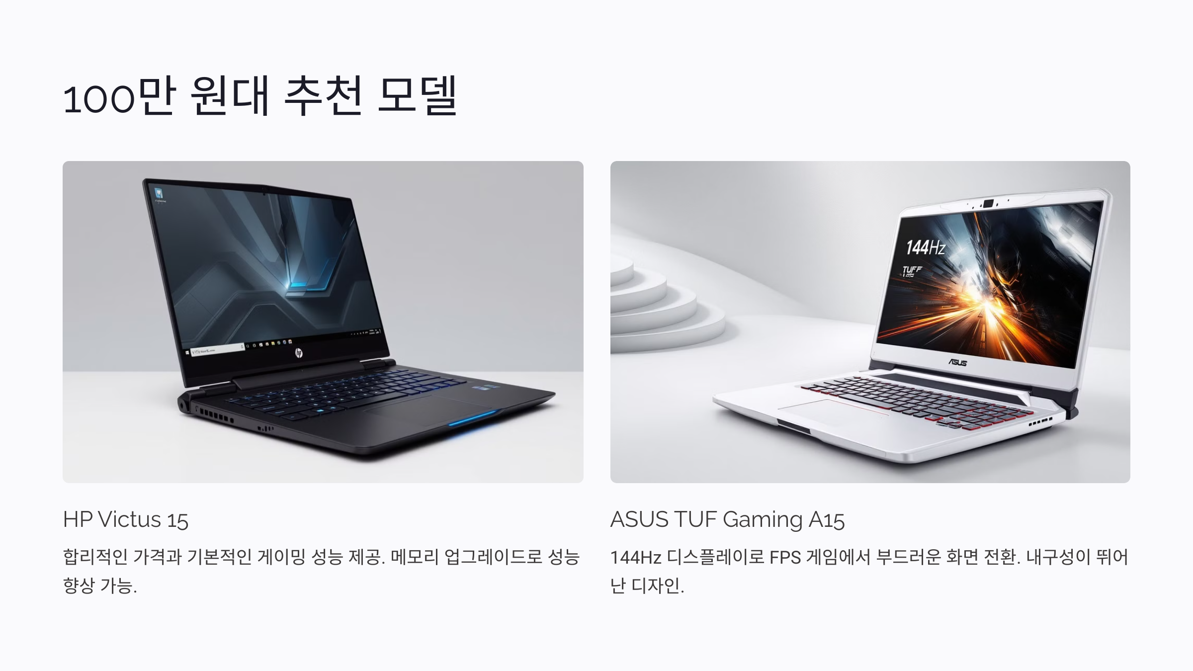 | 100만 원대 | HP Victus 15 | GTX 1650 | Ryzen 5 5600H | FHD, 60Hz | 입문용, 롤/오버워치 적합 |