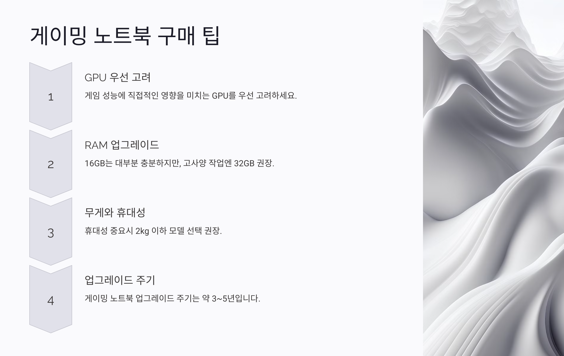 A8. 게이밍 노트북의 업그레이드 주기는 약 3~5년이에요. GPU와 CPU는 교체가 어렵기 때문에, 처음부터 최신 사양을 선택하는 것이 좋아요. RAM과 저장장치는 업그레이드 가능성이 있는 모델을 선택하면 사용 기간을 늘릴 수 있어요.