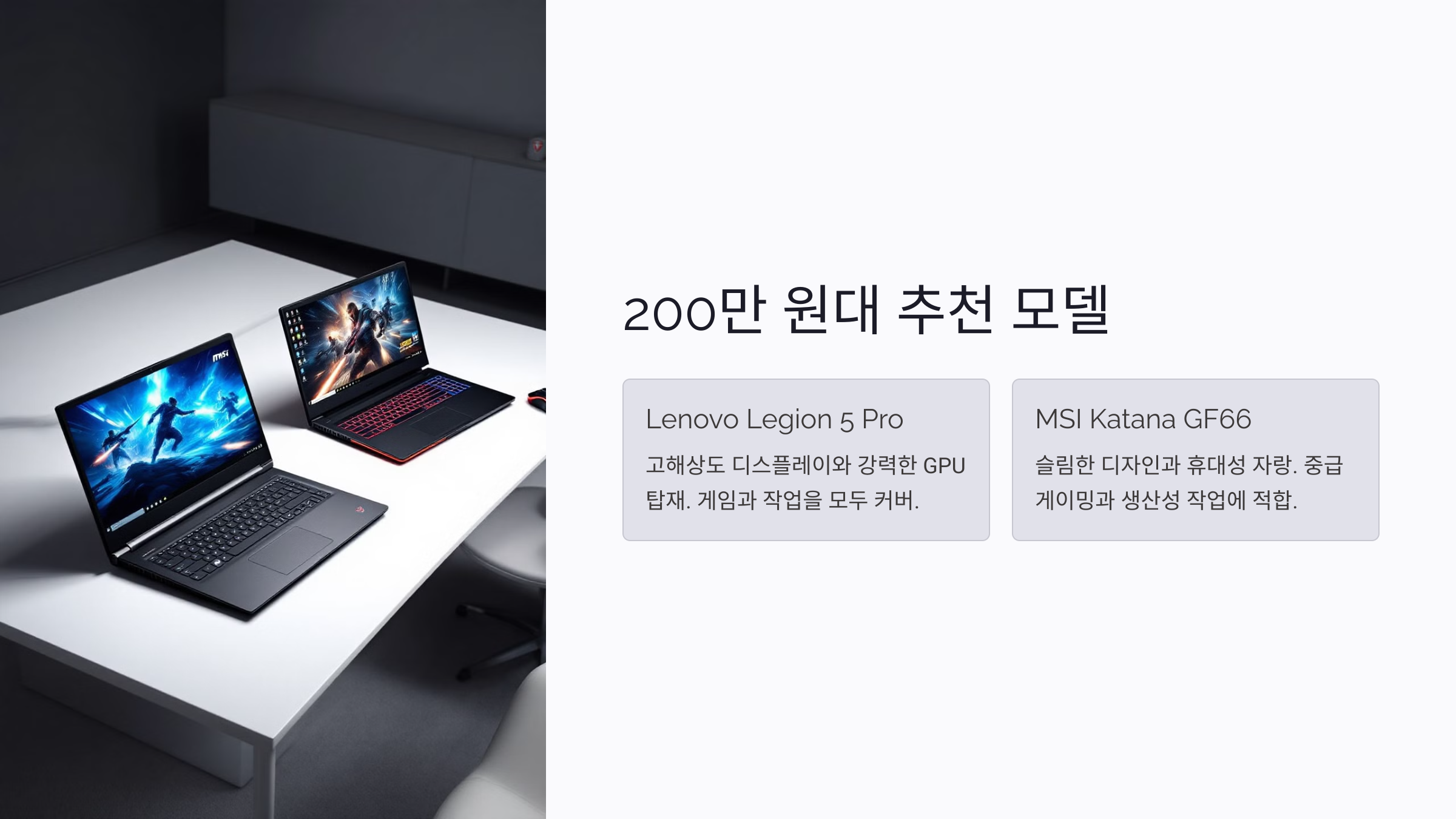 200만 원대는 RTX 4060과 같은 중고급 GPU를 탑재한 모델이 많아, 최신 AAA 게임도 높은 그래픽 설정에서 원활히 실행 가능해요. 가성비와 성능의 균형이 가장 좋은 가격대라고 할 수 있어요.