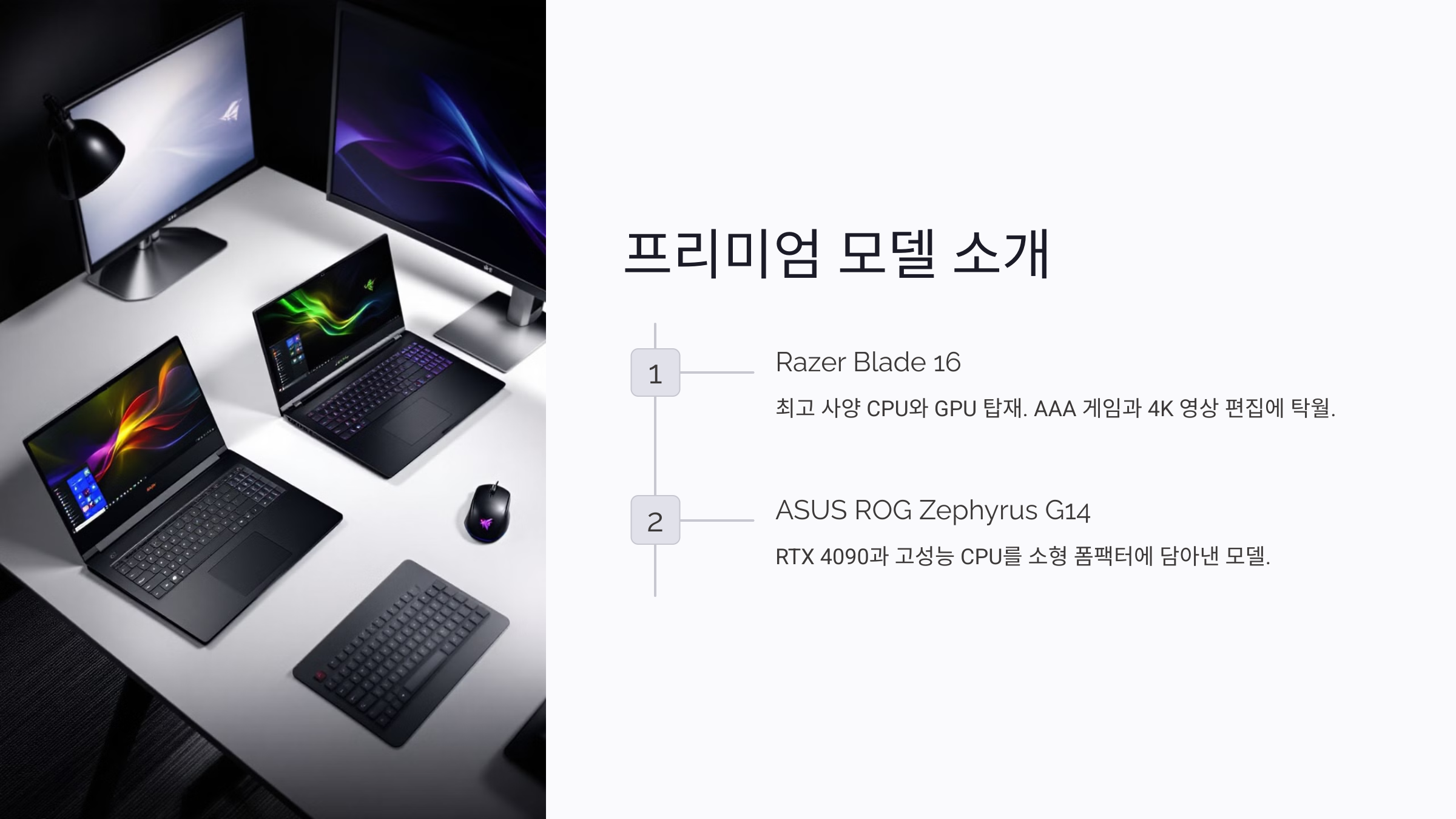 | 300만 원 이상 | Razer Blade 16 | RTX 4080 | Core i9-13980HX | UHD+, 120Hz | 4K 게임, 프리미엄 디자인 |