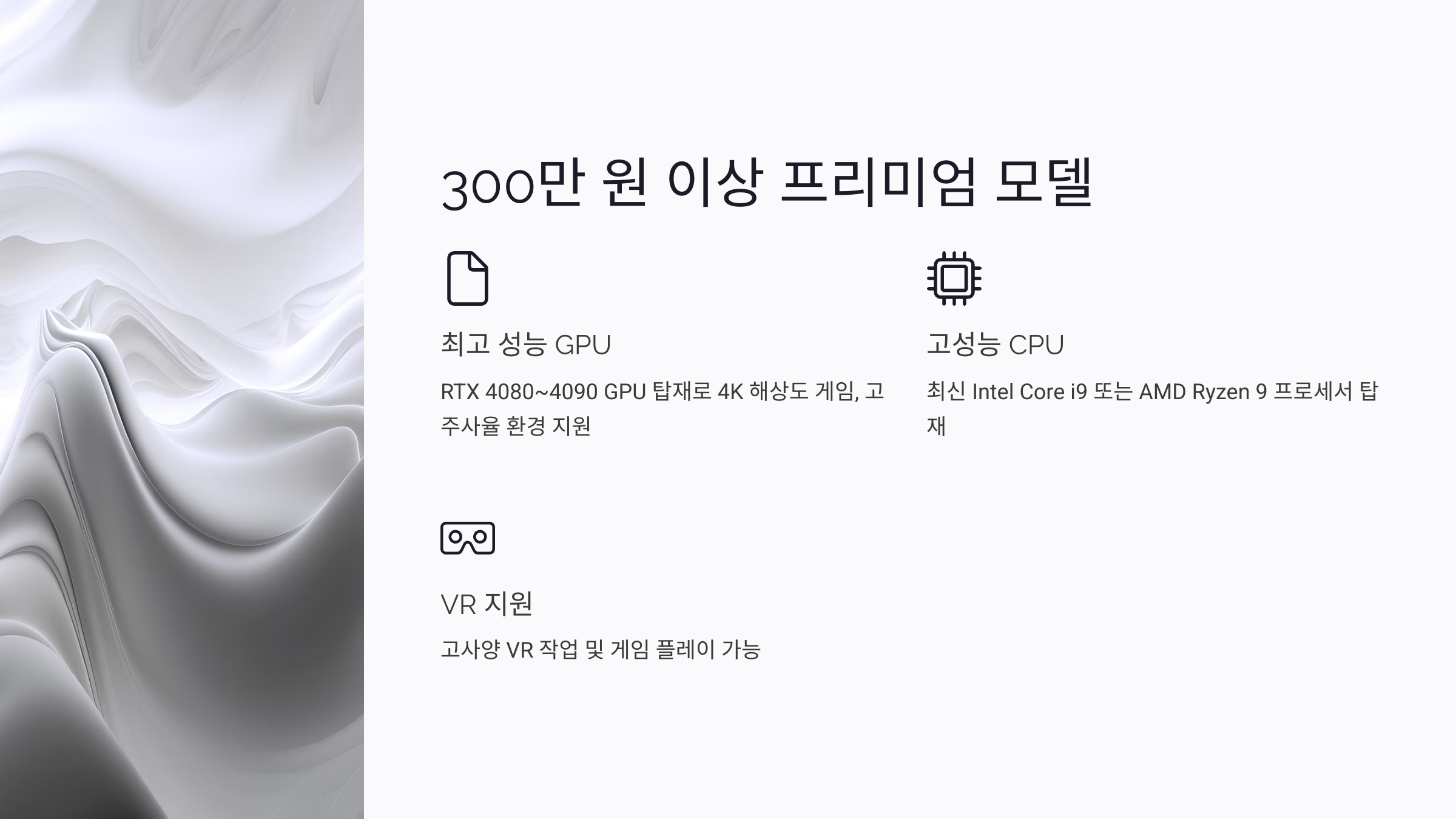 A3. 300만 원 이상의 모델은 4K 해상도, 고주사율 환경에서 최고의 성능을 발휘하며, 고성능 작업과 게임 모두 커버할 수 있어요.