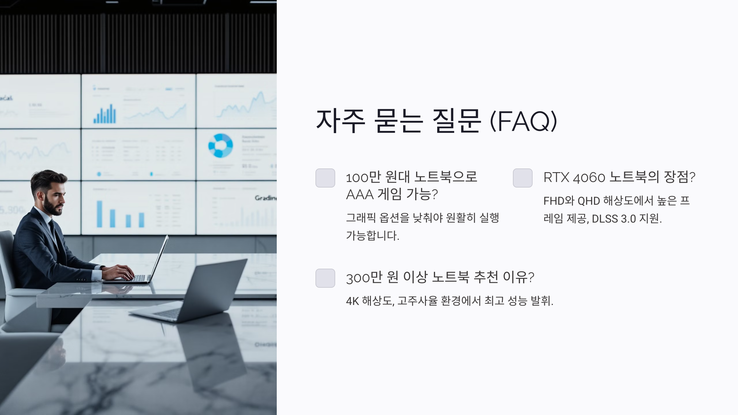 A1. 100만 원대 노트북은 롤, 오버워치 같은 게임에 적합하며, AAA 게임은 그래픽 옵션을 낮춰야 원활히 실행 가능해요.