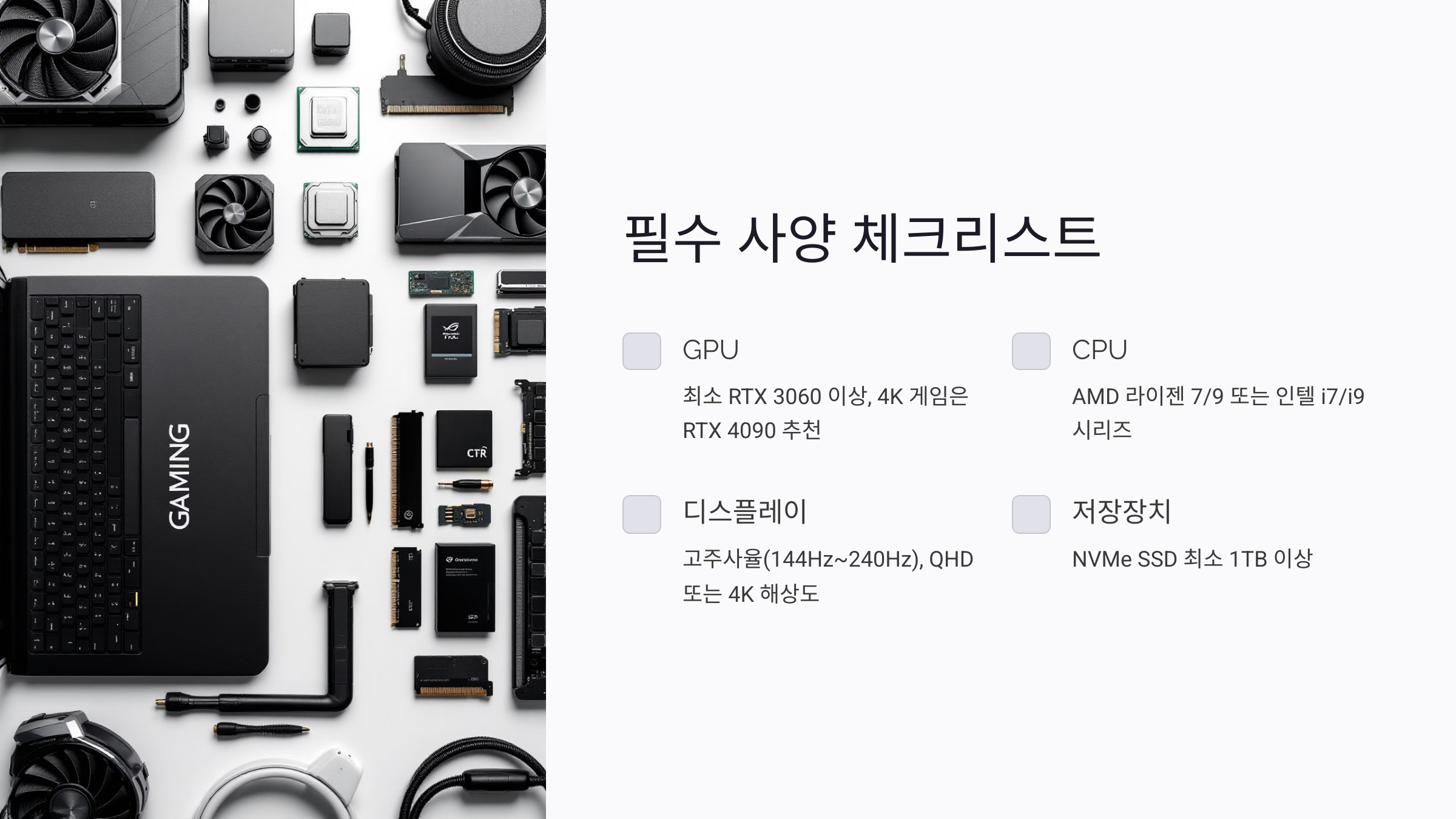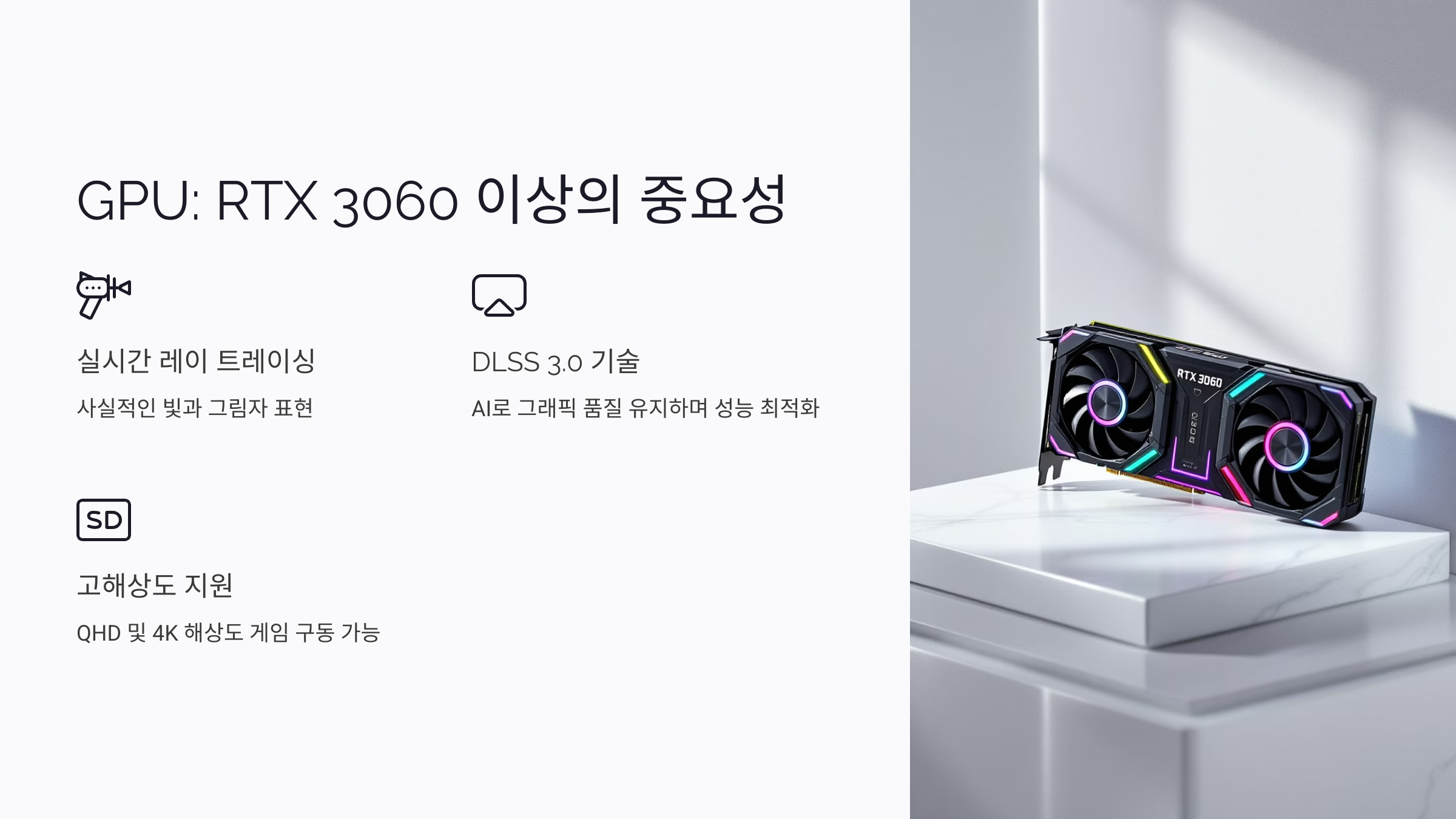 - GPU (그래픽 카드): 최소 RTX 3060 이상. 4K 게임과 고주사율 환경에서는 RTX 4090이 추천돼요.