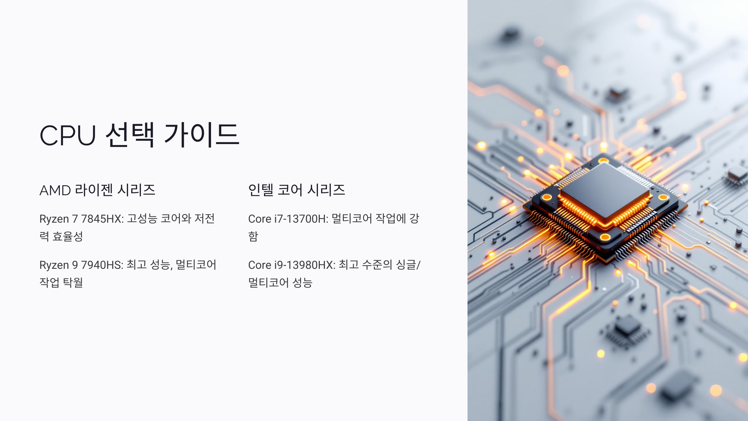 AMD 라이젠 시리즈는 멀티스레드 작업에서 효율적이고, 인텔은 단일 스레드 성능이 뛰어난 편이에요. 자신의 사용 목적에 따라 선택하면 돼요.