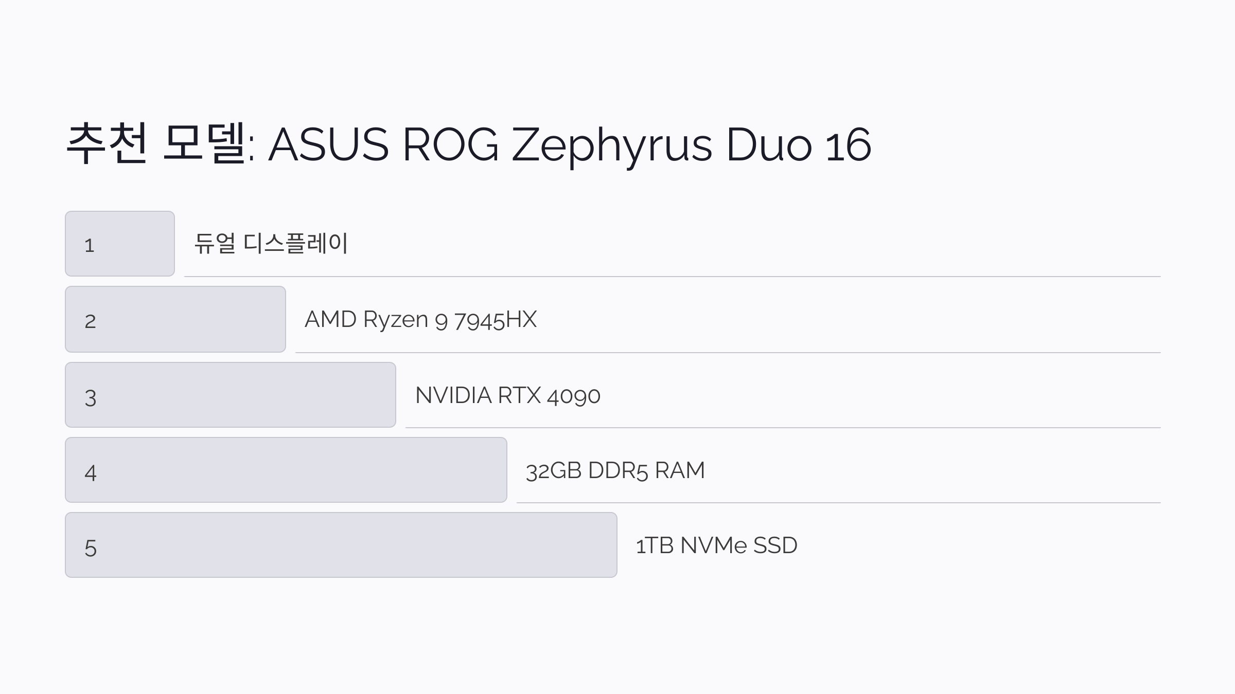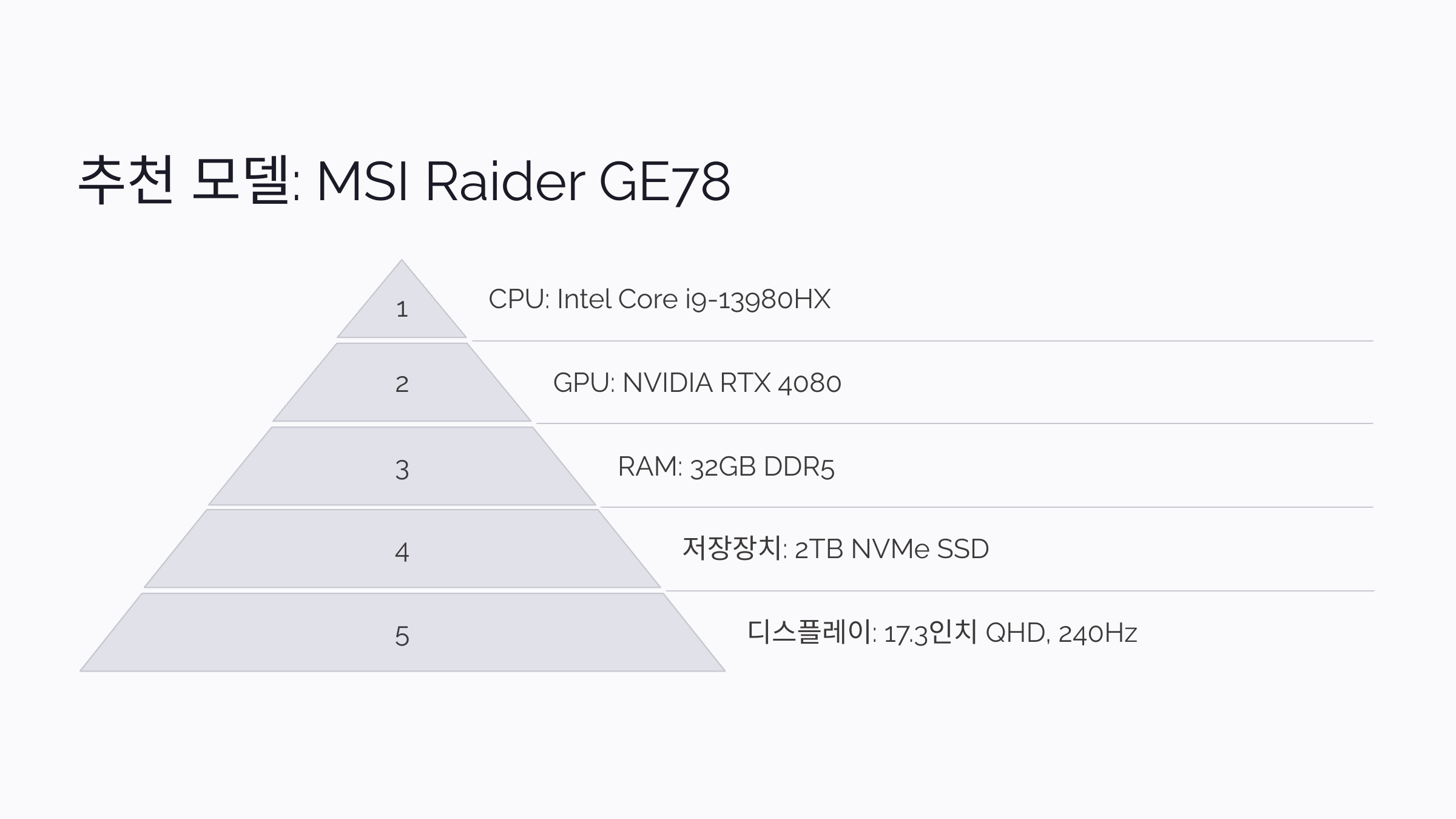 주요 추천 모델: MSI Raider GE78, ASUS ROG Zephyrus Duo