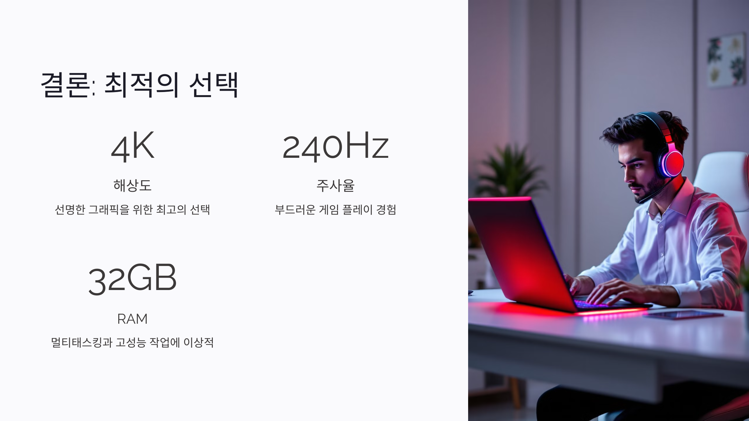 - 디스플레이: 고주사율(144Hz~240Hz)과 QHD 또는 4K 해상도를 지원하는 화면.