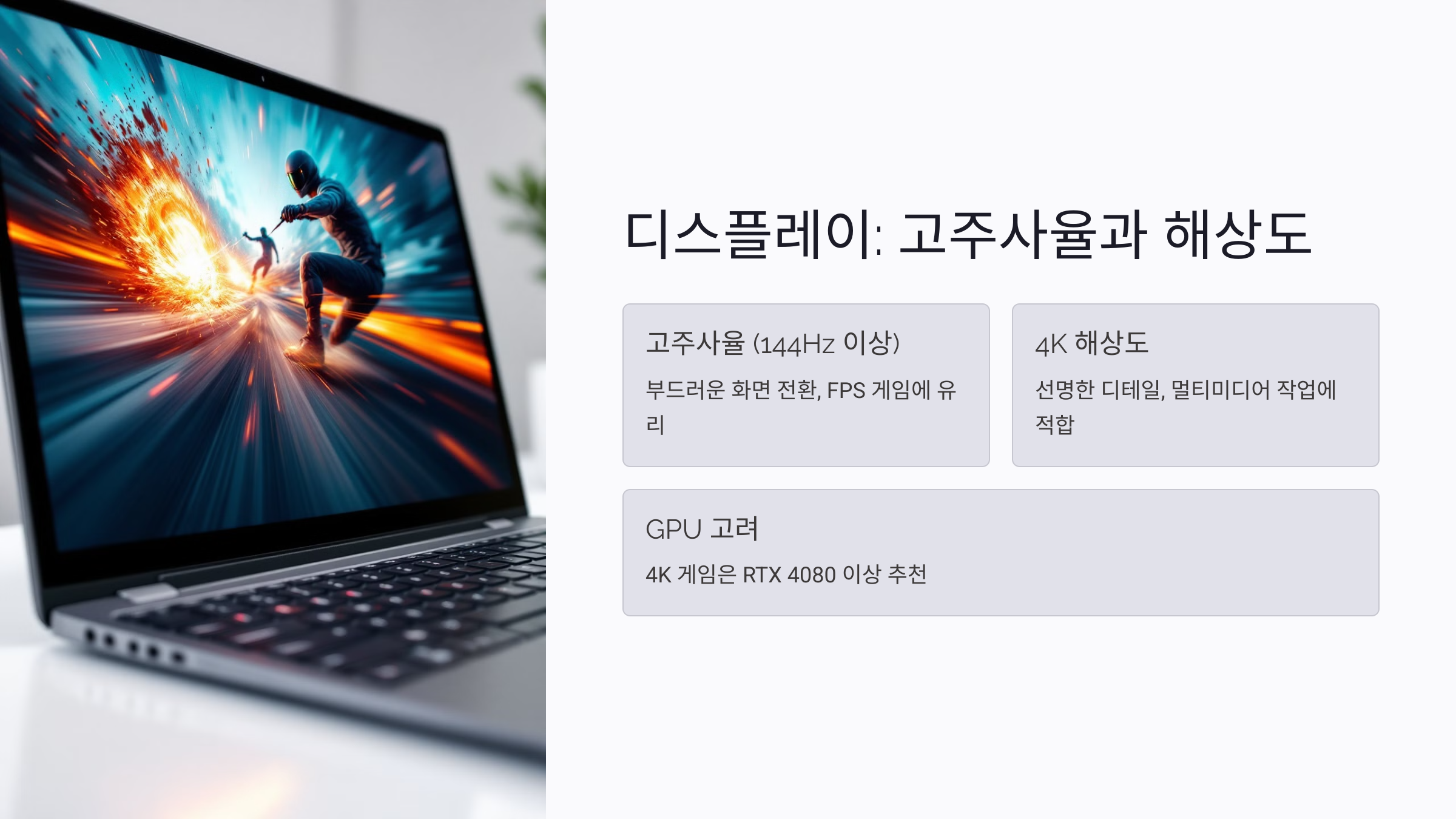 디스플레이는 게이밍 경험에 직접적으로 영향을 미치는 중요한 요소예요. 고사양 게이밍 노트북을 선택할 때, **고주사율**과 **고해상도**는 필수적으로 고려해야 해요.