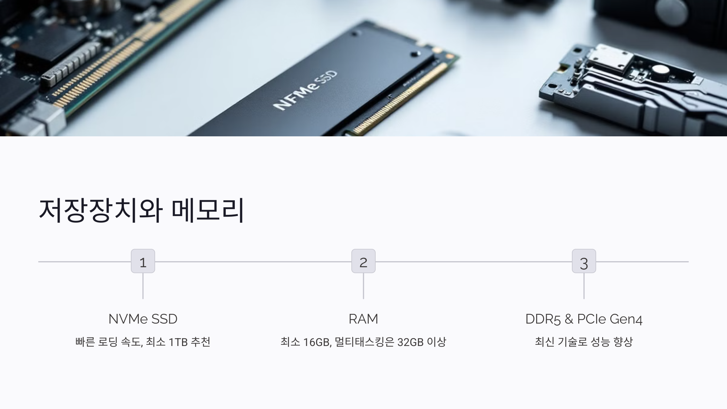 - 저장장치: NVMe SSD로 최소 1TB 이상. 빠른 로딩 속도를 위해 필수적이에요.