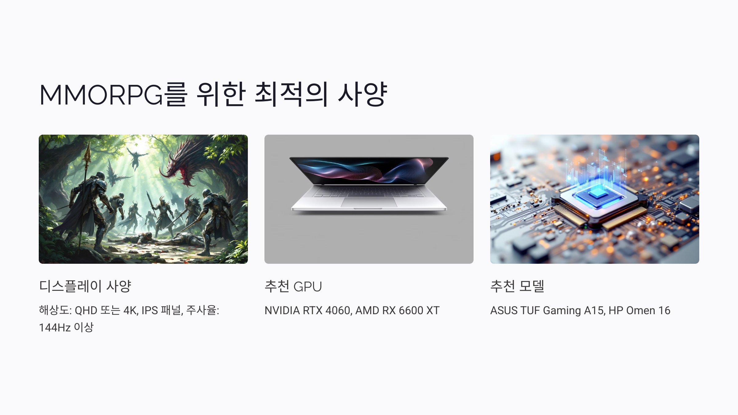 MMORPG는 아름다운 그래픽과 세부적인 디테일을 표현하는 것이 중요한 장르예요. 따라서 4K 해상도와 선명한 색감을 제공하는 IPS 패널 디스플레이를 갖춘 노트북이 추천돼요.