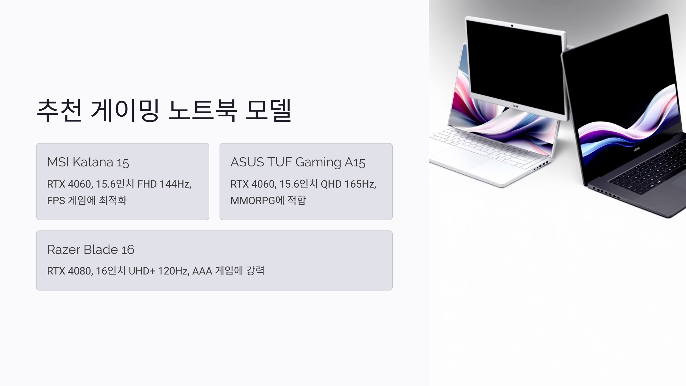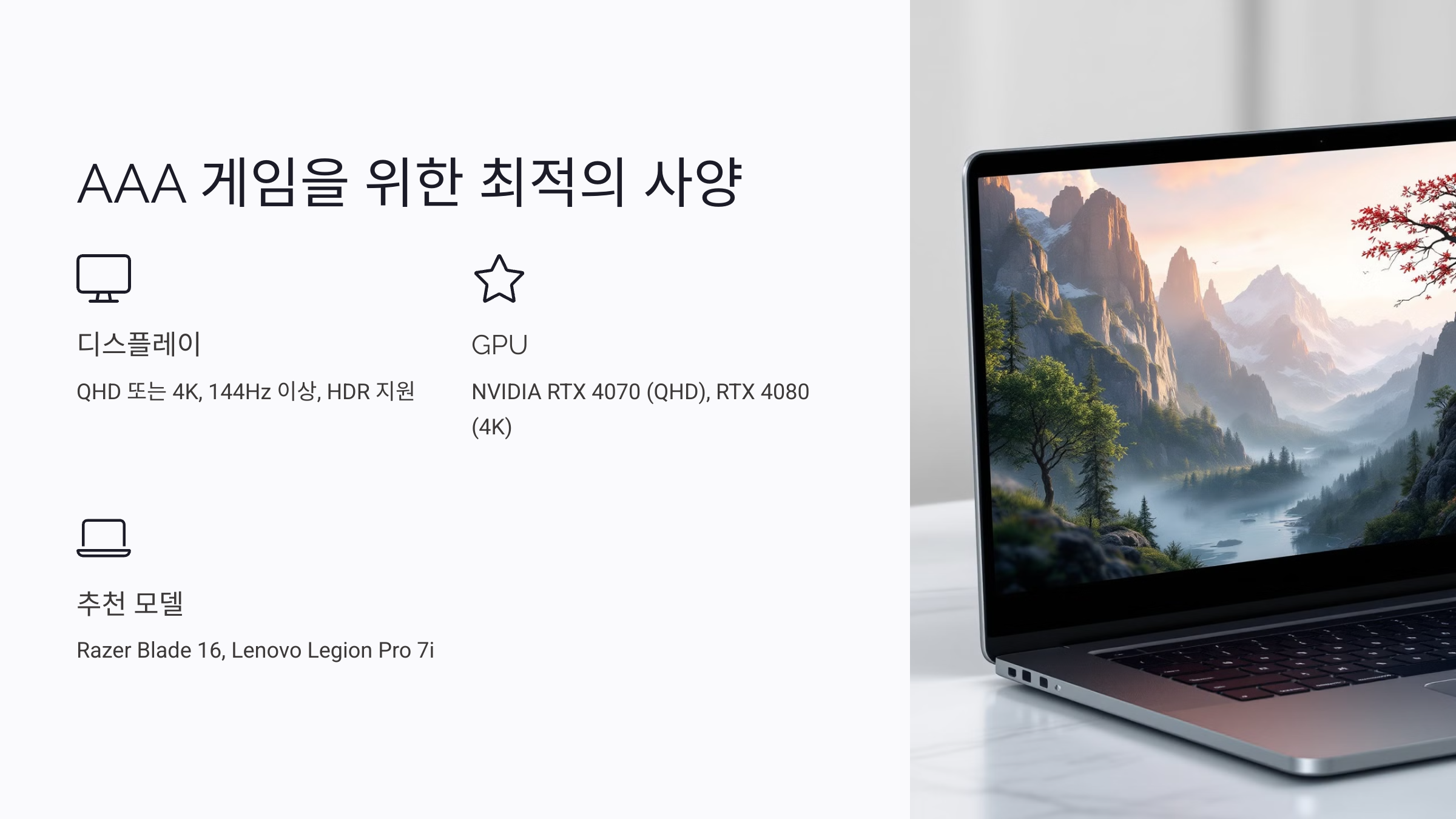 AAA 게임은 높은 그래픽 품질과 복잡한 연산이 필요한 최신 게임들로, 강력한 GPU와 디스플레이가 필수적이에요. RTX 4070 이상과 144Hz 이상의 고주사율 디스플레이를 갖춘 모델을 추천드려요.
