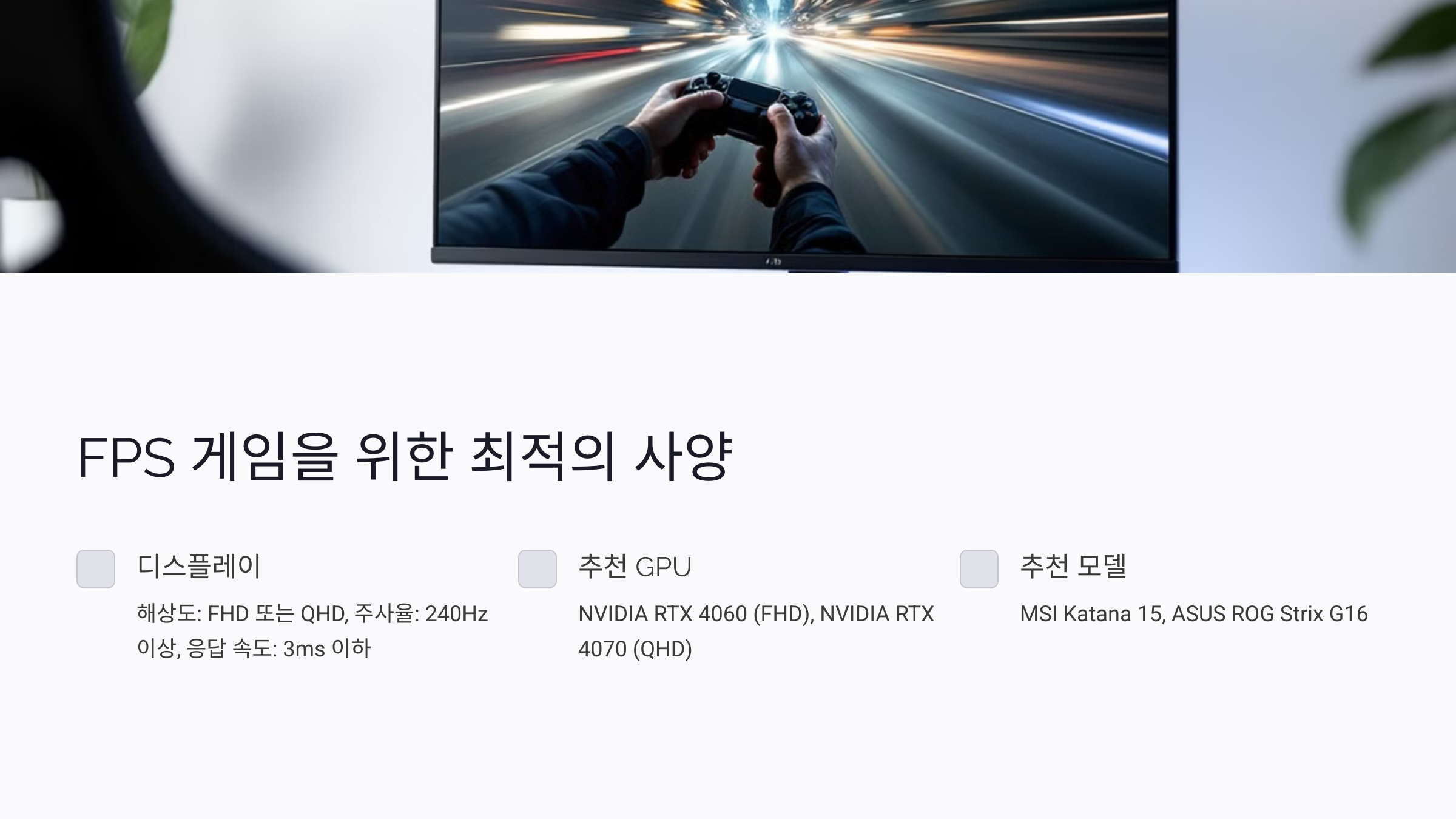 FPS 게임에서는 빠른 반응 속도와 부드러운 화면 전환이 승패를 가를 수 있어요. 따라서 고주사율 디스플레이(240Hz 이상)와 RTX 4060/4070 같은 강력한 GPU가 필수적이에요.