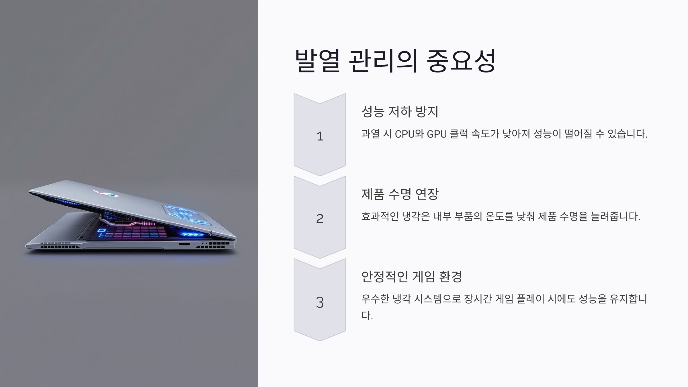 고성능 게이밍 노트북은 고사양 부품을 탑재하기 때문에 발열이 필연적으로 발생해요. 발열 관리를 제대로 하지 않으면 성능 저하와 제품 수명 단축으로 이어질 수 있답니다.