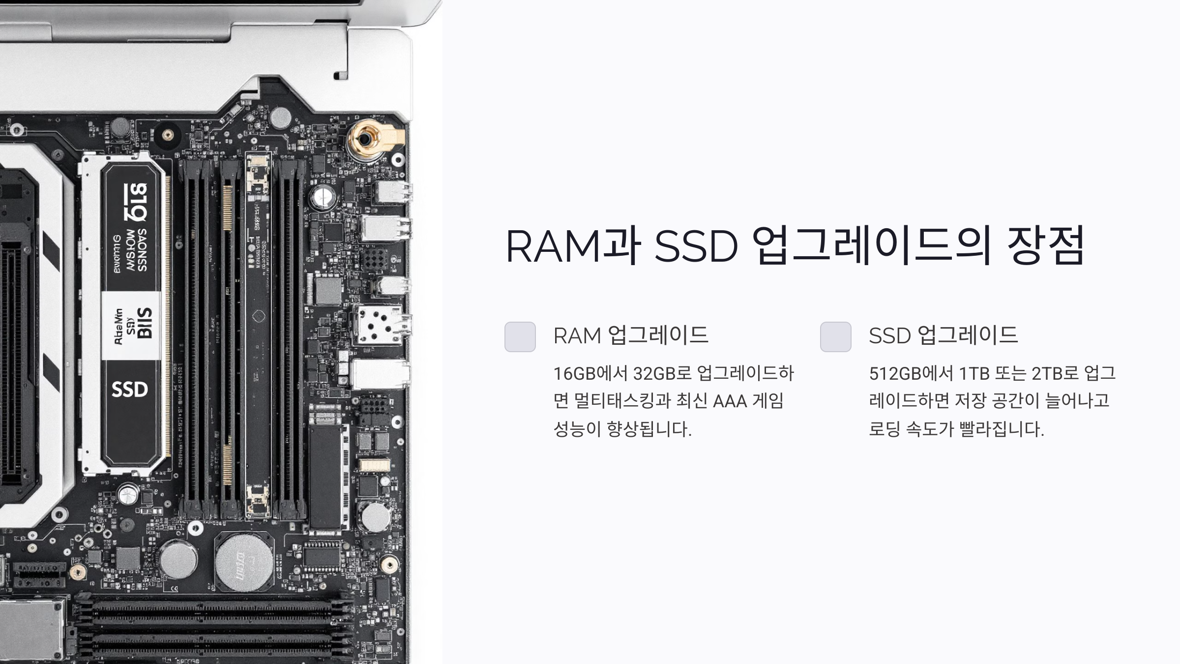 - 기본 512GB SSD를 1TB 또는 2TB로 업그레이드하면, 고용량 게임과 작업 파일을 저장하는 데 유리해요.