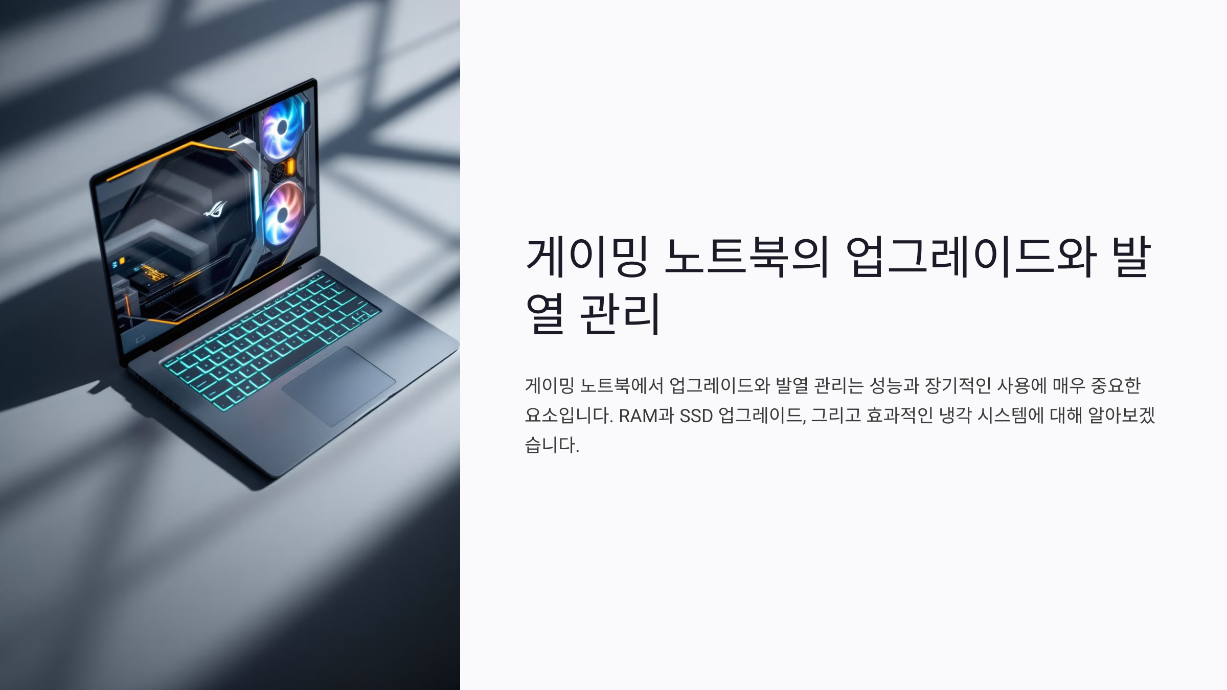 게이밍 노트북에서 업그레이드와 발열 관리는 성능과 장기적인 사용에 매우 중요한 요소예요. 특히 RAM과 SSD를 쉽게 업그레이드할 수 있는 모델은 성능을 지속적으로 향상시킬 수 있는 장점이 있죠. 또한, 발열 관리를 통해 성능 저하 없이 안정적인 게임 환경을 제공하는 것도 필수입니다. 여기에서는 업그레이드 가능한 모델과 우수한 냉각 시스템을 갖춘 게이밍 노트북을 소개할게요!