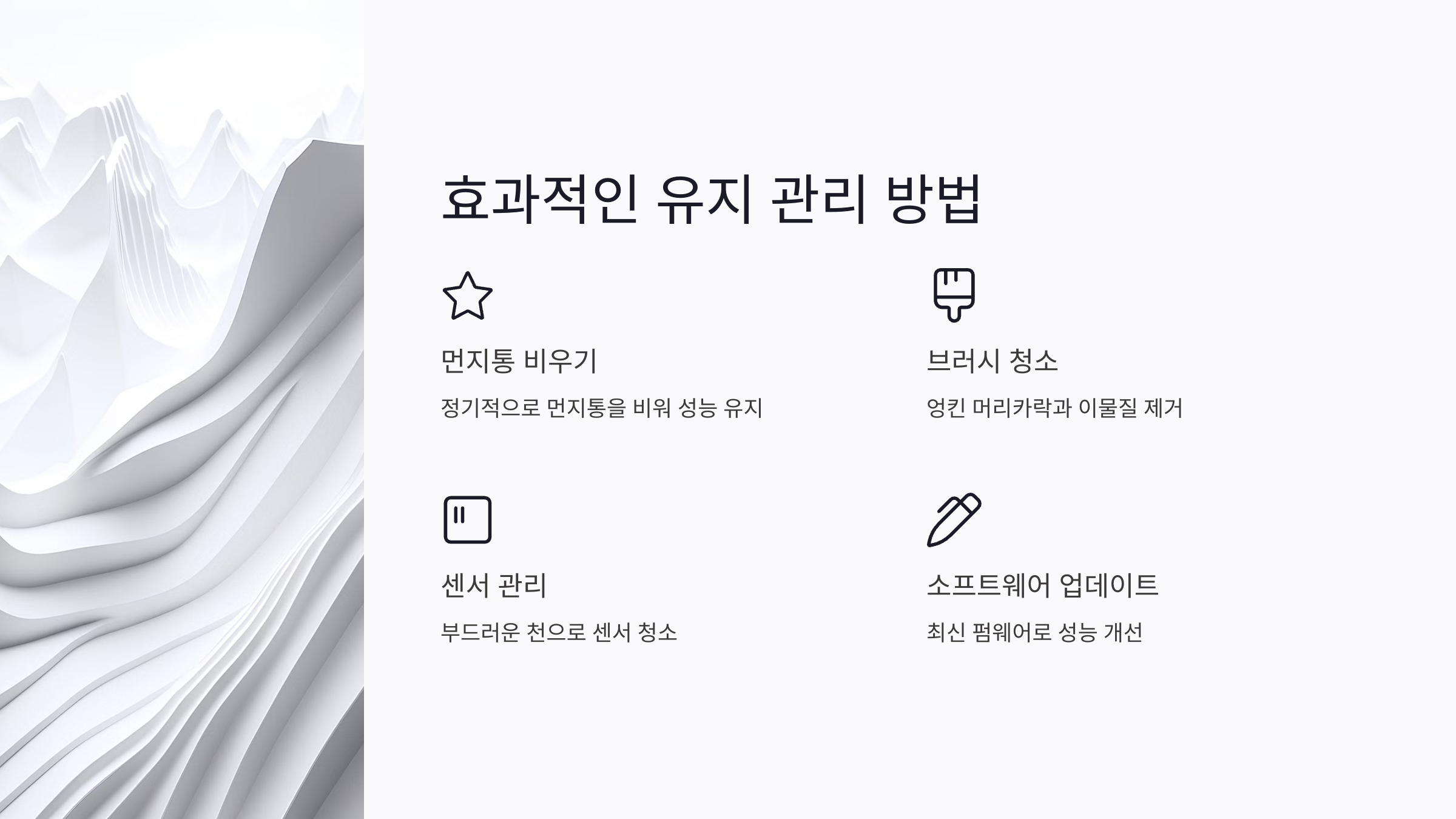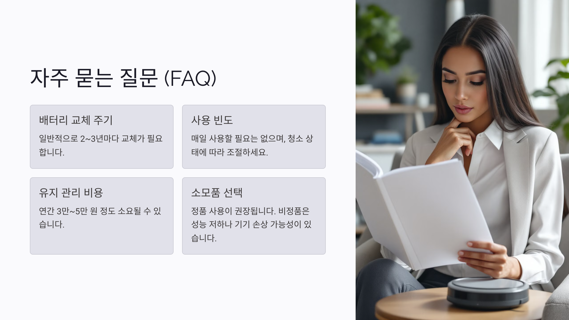 A4. 유지 관리 비용은 브랜드와 모델에 따라 다르지만, 필터와 브러시 교체 비용을 포함해 연간 3만~5만 원 정도가 소요될 수 있어요.