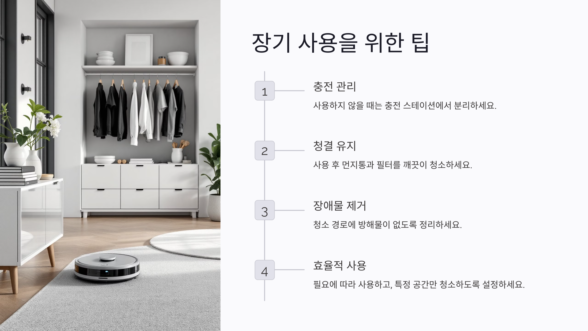 로봇청소기를 더 오래 사용하려면 몇 가지 간단한 팁을 실천하는 것이 좋아요. 첫째, 기기를 사용하지 않을 때는 충전 스테이션에서 분리하여 배터리 과충전을 방지하는 것이 좋아요. 둘째, 사용 후에는 먼지통과 필터를 항상 깨끗하게 유지해야 해요.