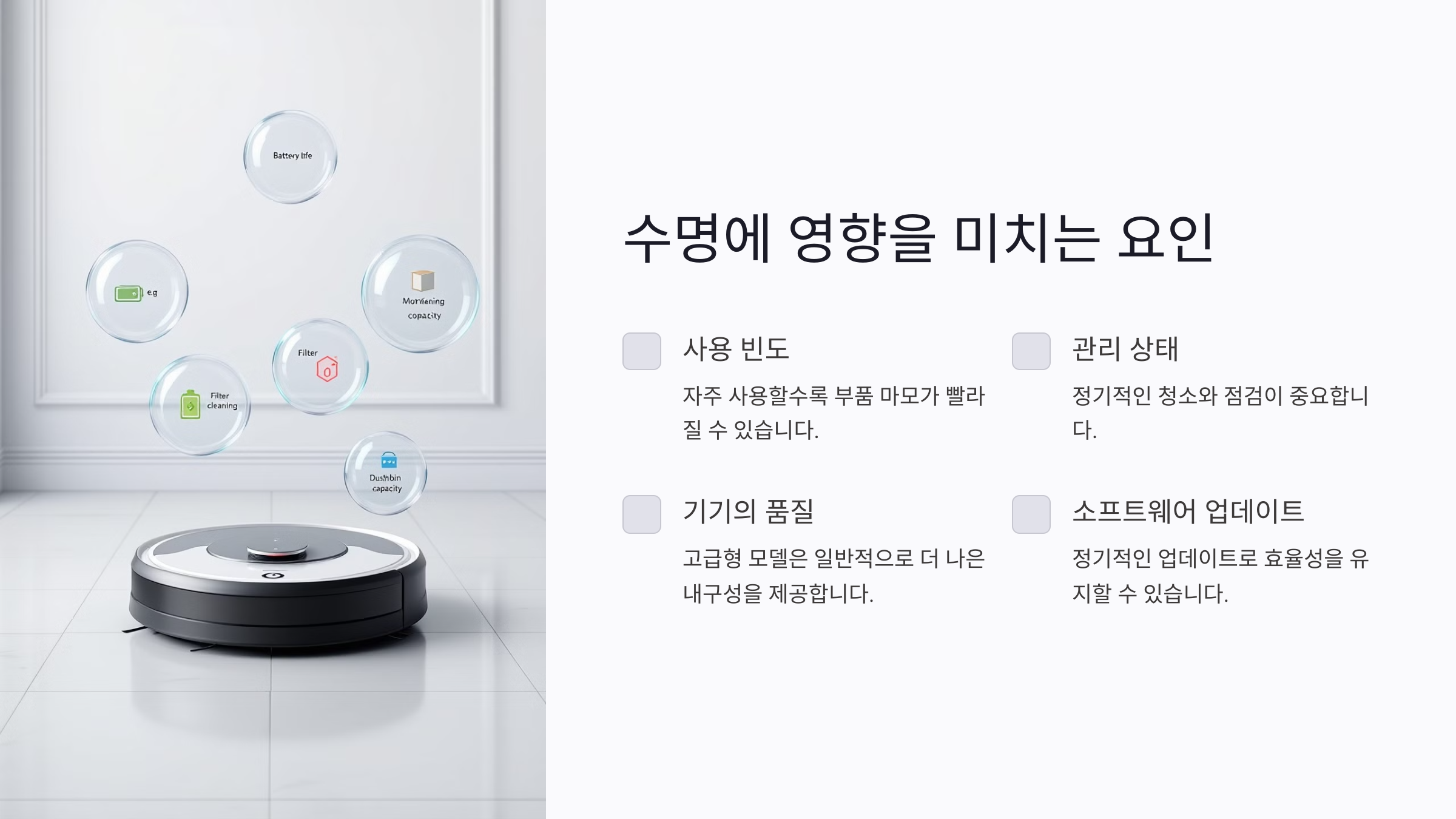 로봇청소기의 수명은 여러 요인에 의해 결정돼요. 가장 중요한 요인은 사용 빈도, 관리 상태, 그리고 기기의 품질이에요. 만약 너무 자주 사용하거나 비정상적인 환경에서 가동된다면, 부품 마모가 빠르게 진행될 가능성이 있어요.