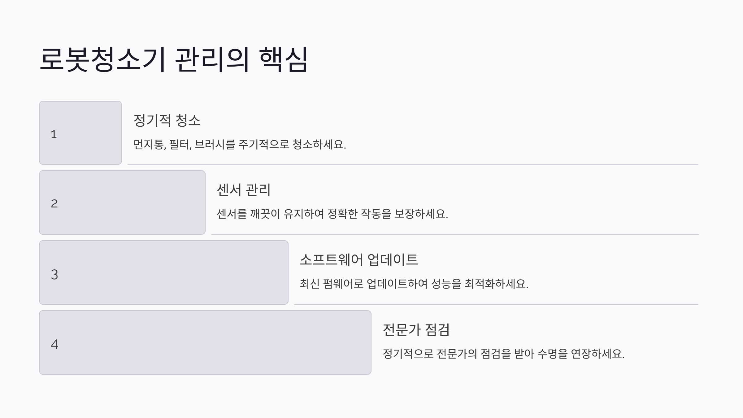 로봇청소기의 고장은 유지 관리 부족으로도 발생할 수 있어요. 먼지통이 가득 찬 상태에서 계속 작동하면 흡입 모터에 과부하가 걸릴 수 있고, 필터가 막히면 흡입력이 크게 저하될 수 있어요. 따라서 청소 후에는 먼지통을 비우고, 필터를 세척하는 것이 중요하답니다.