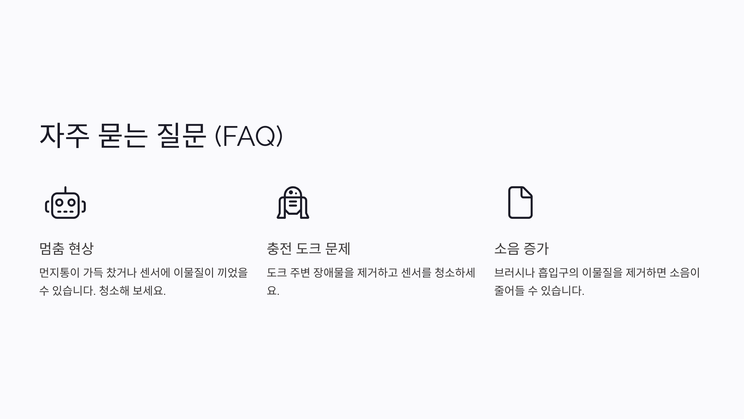A2. 충전 도크 주변에 장애물이 있거나 센서에 먼지가 묻어 있을 수 있어요. 도크 주변을 정리하고 센서를 청소해 보세요.