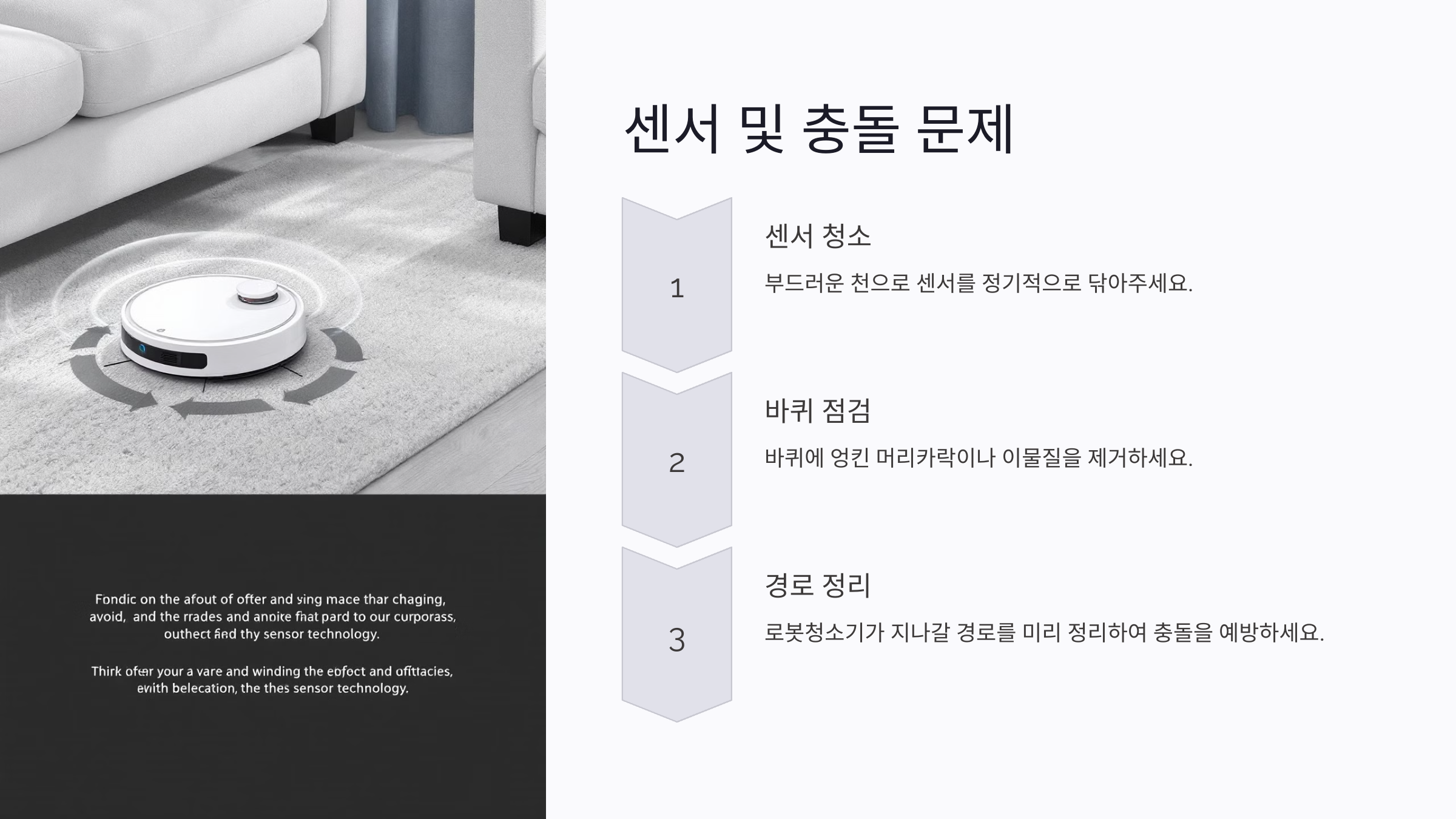 이러한 문제를 예방하려면 센서를 정기적으로 청소하고, 로봇청소기가 지나갈 경로를 미리 정리하는 습관을 들이는 것이 좋아요. 선이나 작은 물건이 바닥에 놓여 있으면 충돌 확률이 높아지니 주의해 주세요.