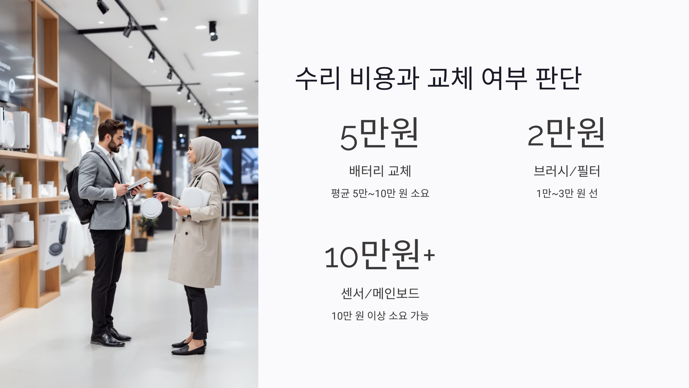 예를 들어, 배터리 교체 비용은 평균 5만~10만 원 정도이며, 브러시나 필터는 1만~3만 원 선이에요. 하지만 주요 부품인 센서나 메인보드 교체는 10만 원 이상이 들 수 있으니, 제품의 남은 수명을 고려해 결정을 내려야 해요.