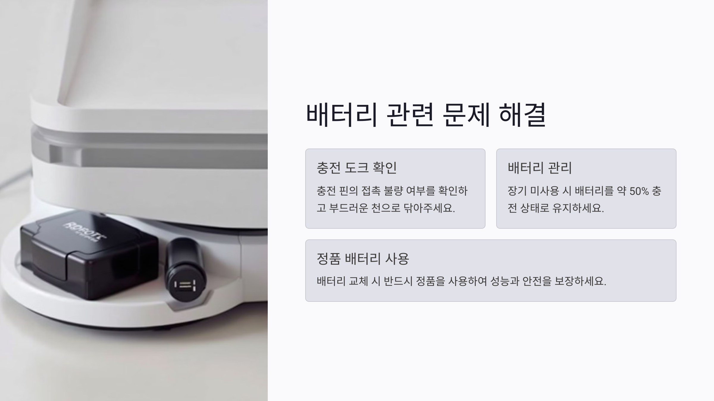 배터리 문제는 로봇청소기 고장의 주요 원인 중 하나예요. 배터리가 충전되지 않거나, 사용 시간이 급격히 짧아졌다면 배터리 성능이 저하된 것일 수 있어요. 이럴 때는 배터리를 재설치하거나 교체해야 할 가능성이 높답니다.