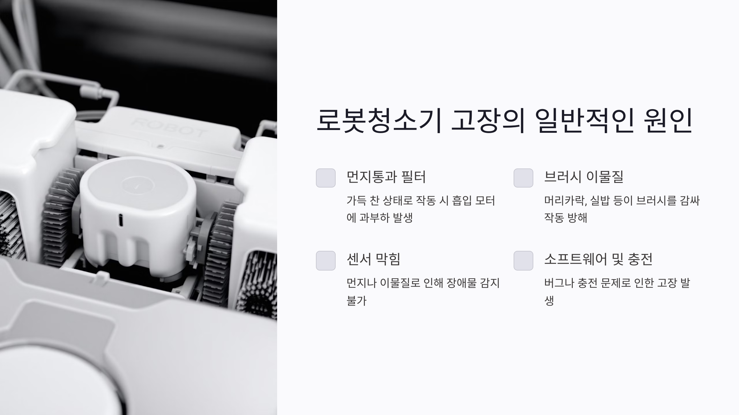 로봇청소기의 고장은 대부분 다음과 같은 이유로 발생해요. 첫째, 먼지통과 필터가 가득 찬 상태에서 계속 작동시키면 흡입 모터에 과부하가 걸려 문제가 발생할 수 있어요. 정기적으로 먼지통을 비우고 필터를 세척하는 것이 중요하답니다.
