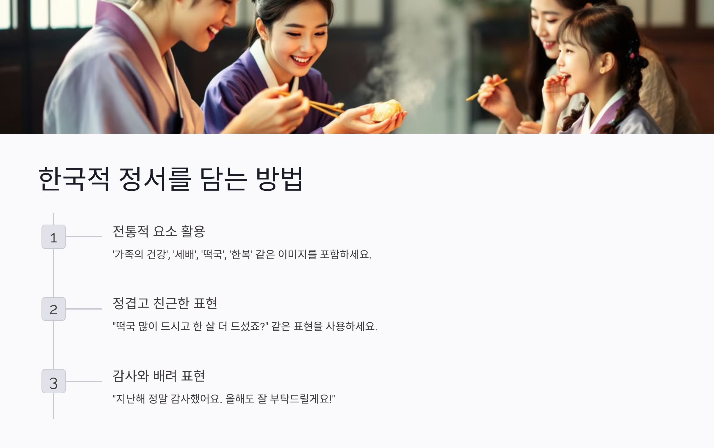 4️⃣ 한국 전통에 어울리는 요소 추가: '떡국 먹고 한 살 더 먹기', '세뱃돈' 같은 전통적이면서도 친숙한 키워드를 포함해 명절 분위기를 살려보세요.