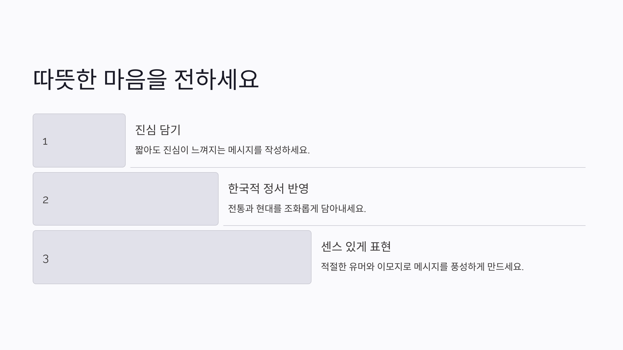 2️⃣ 수신 대상에 맞춤화: 가족, 친구, 동료, 거래처 등 메시지 받는 사람의 특성을 고려해 톤과 내용을 맞추는 것이 좋아요. 유머가 필요한지, 격식을 차려야 하는지 판단해보세요.