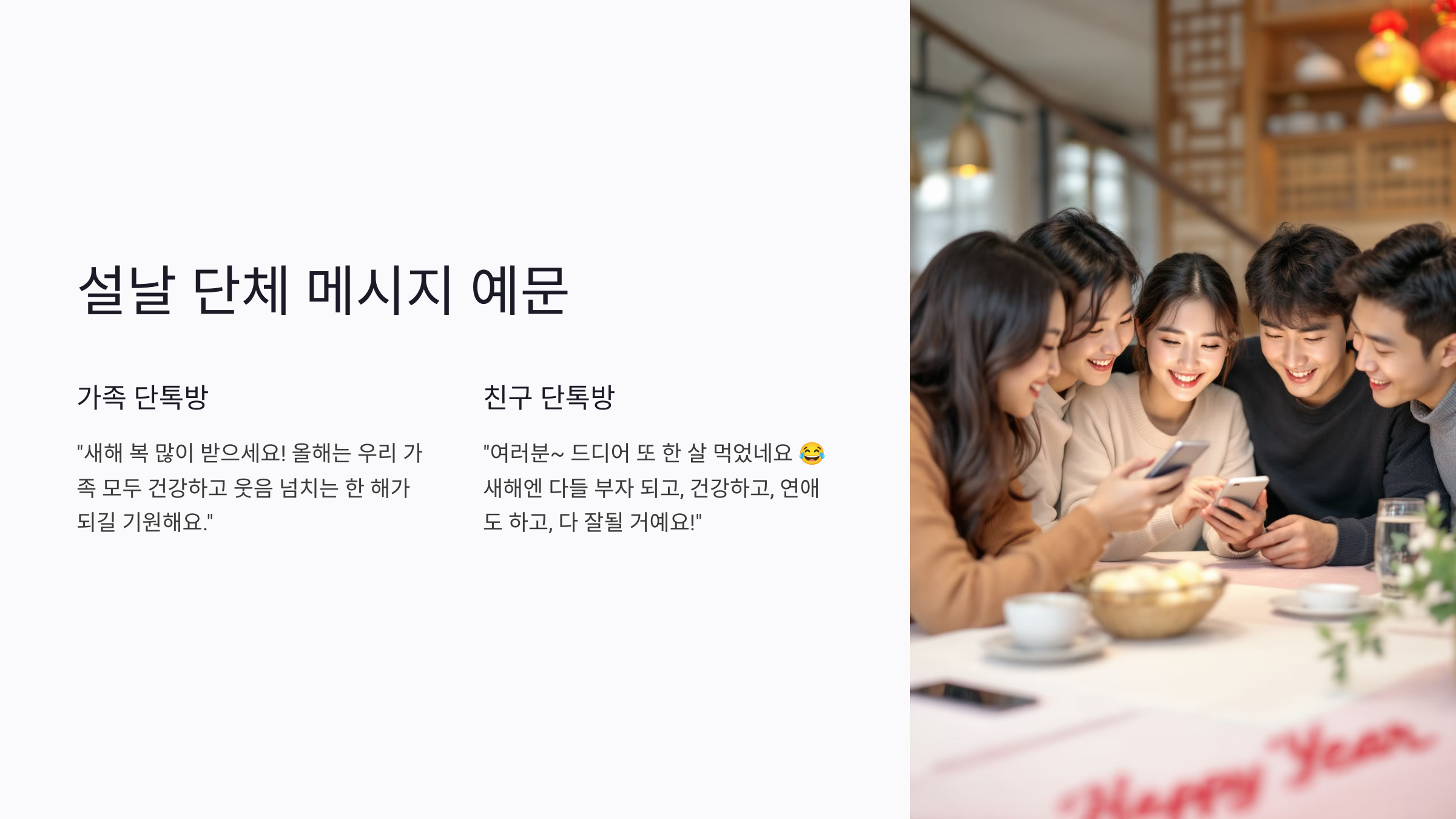 친구 단톡방 예문: "여러분~ 드디어 또 한 살 먹었네요 😂 새해엔 다들 부자 되고, 건강하고, 연애도 하고, 다 잘될 거예요! 이번 설날도 행복하게 보내고, 맛있는 거 많이 먹어요~"
