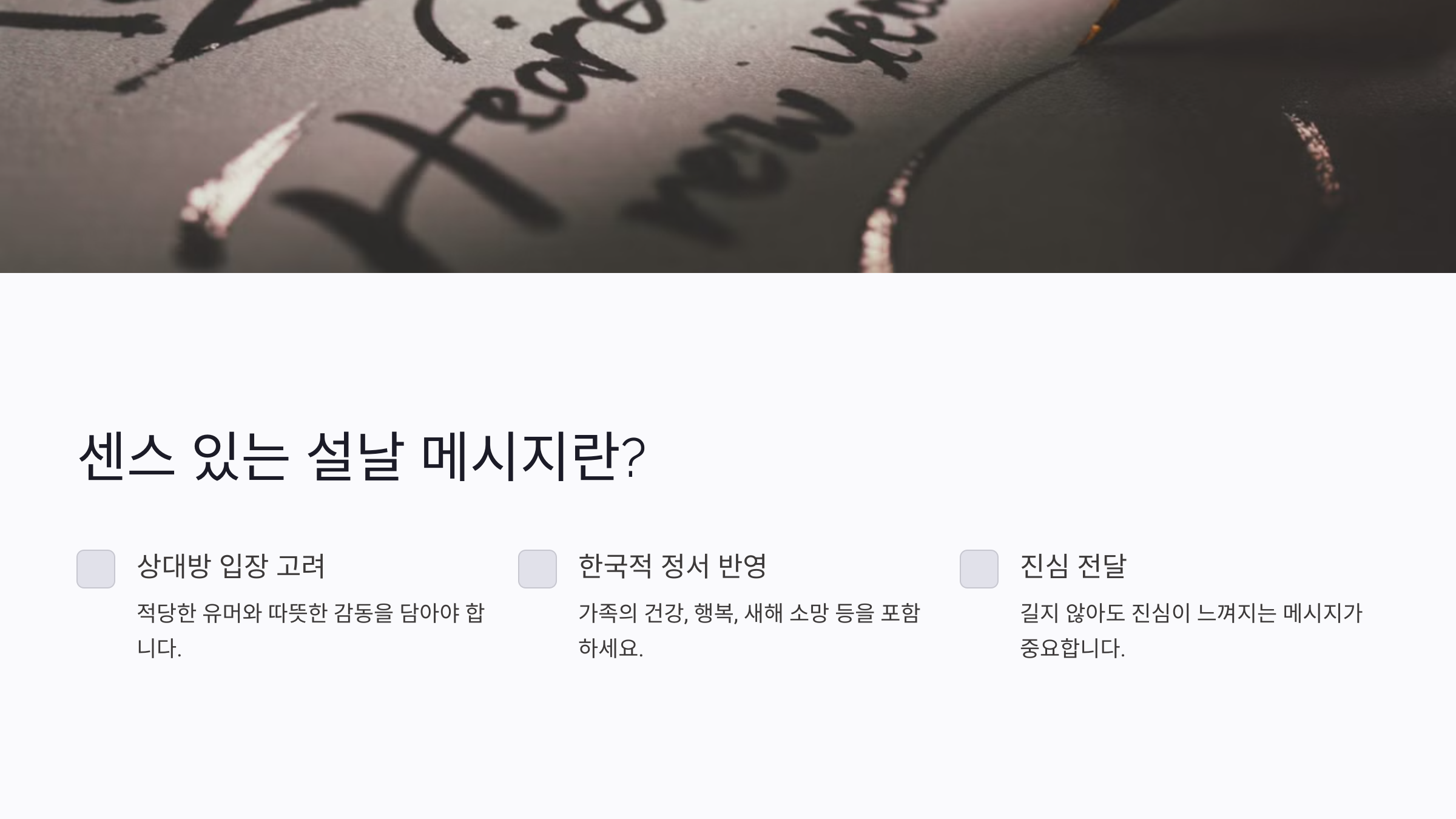 3️⃣ 맞춤 표현 넣기: "새해 복 많이 받으세요"는 기본! 그 위에 각자의 소망, 감사 인사, 유머 등을 추가하면 더욱 특별한 메시지가 돼요.