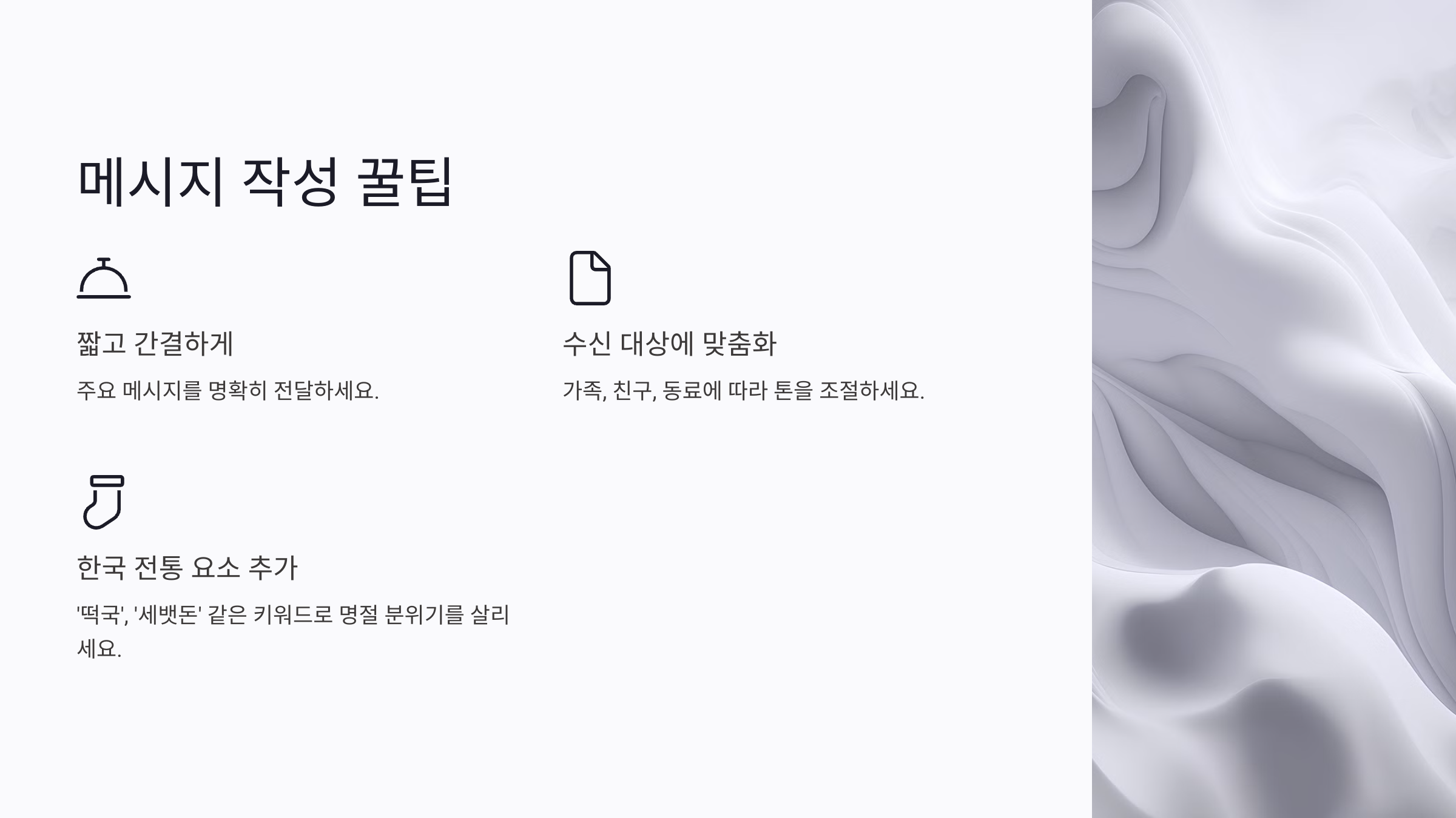 예를 들어, 부모님이나 어르신께는 공손하고 따뜻한 문구가 적합하고, 친구나 동료에게는 살짝 장난기 있는 표현이나 요즘 유행하는 밈을 활용하는 것도 좋은 방법이에요. 메시지는 짧더라도 진심을 담는 것이 중요해요.