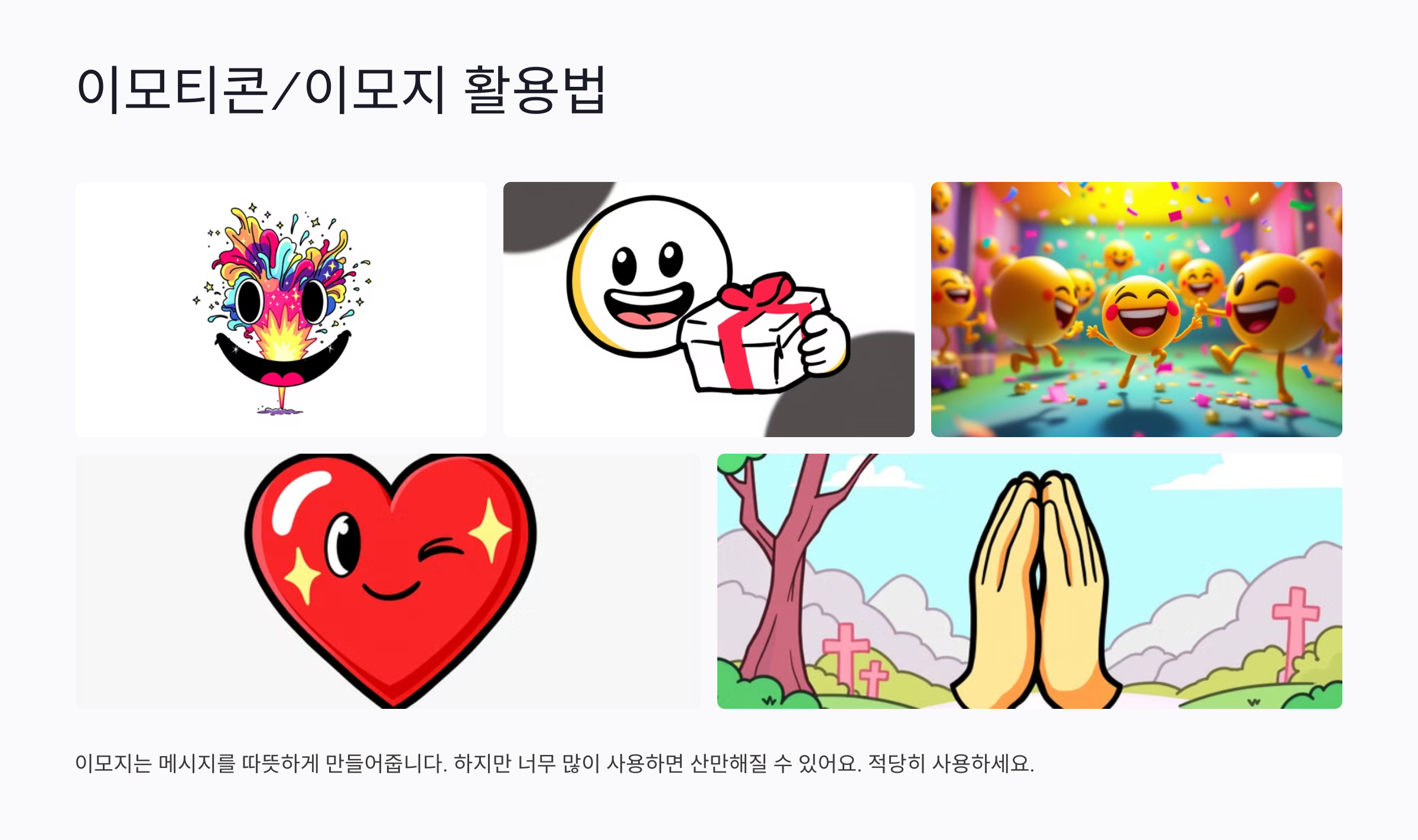 이모지나 이모티콘은 메시지의 분위기를 훨씬 따뜻하게 만들어줘요. 그러나 너무 많이 사용하면 산만해질 수 있으니 적당히 사용하는 게 좋아요.