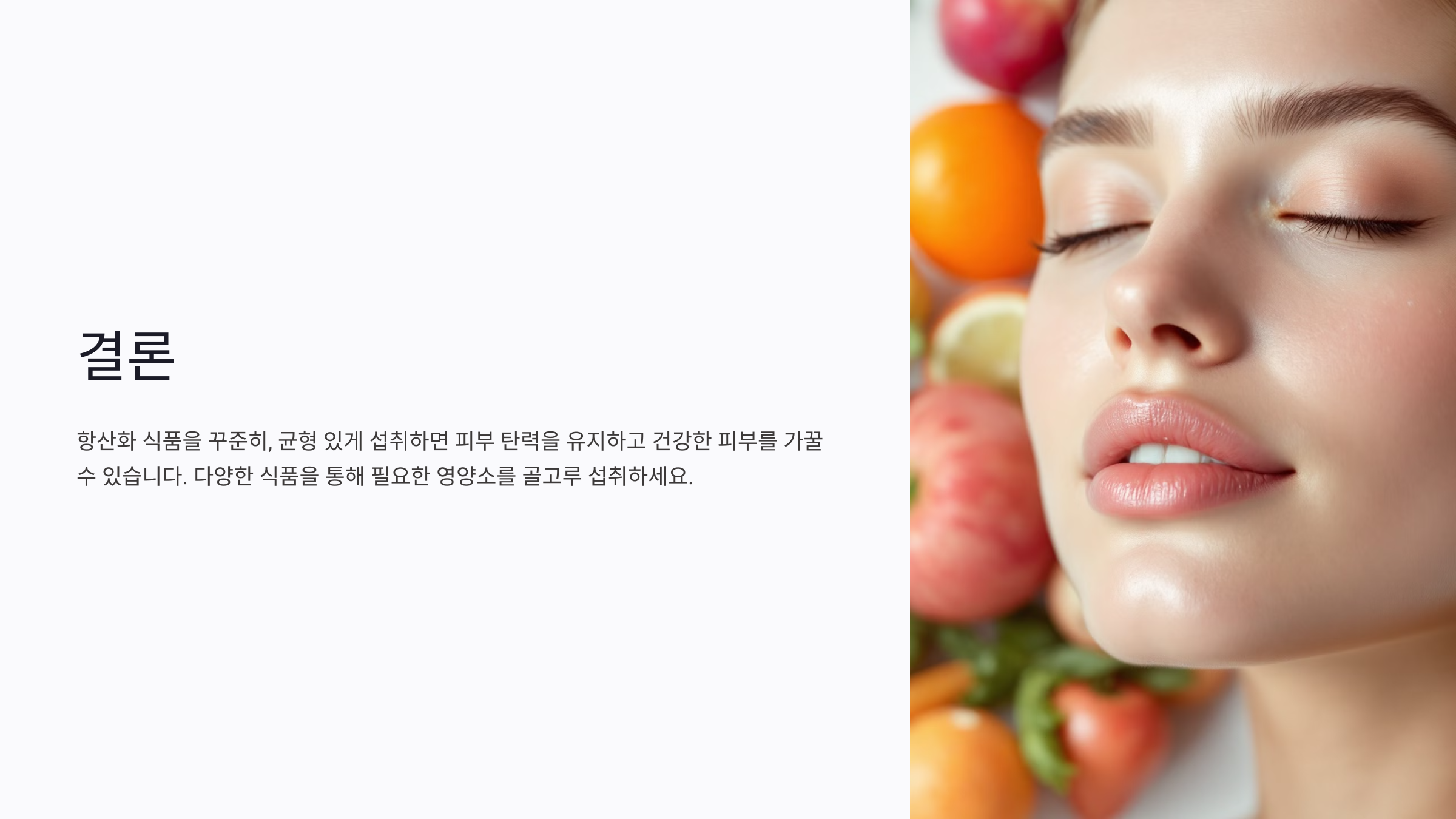이러한 식품을 자주 섭취하면 피부 톤이 균일해지고, 탄력 유지에 큰 도움이 돼요.