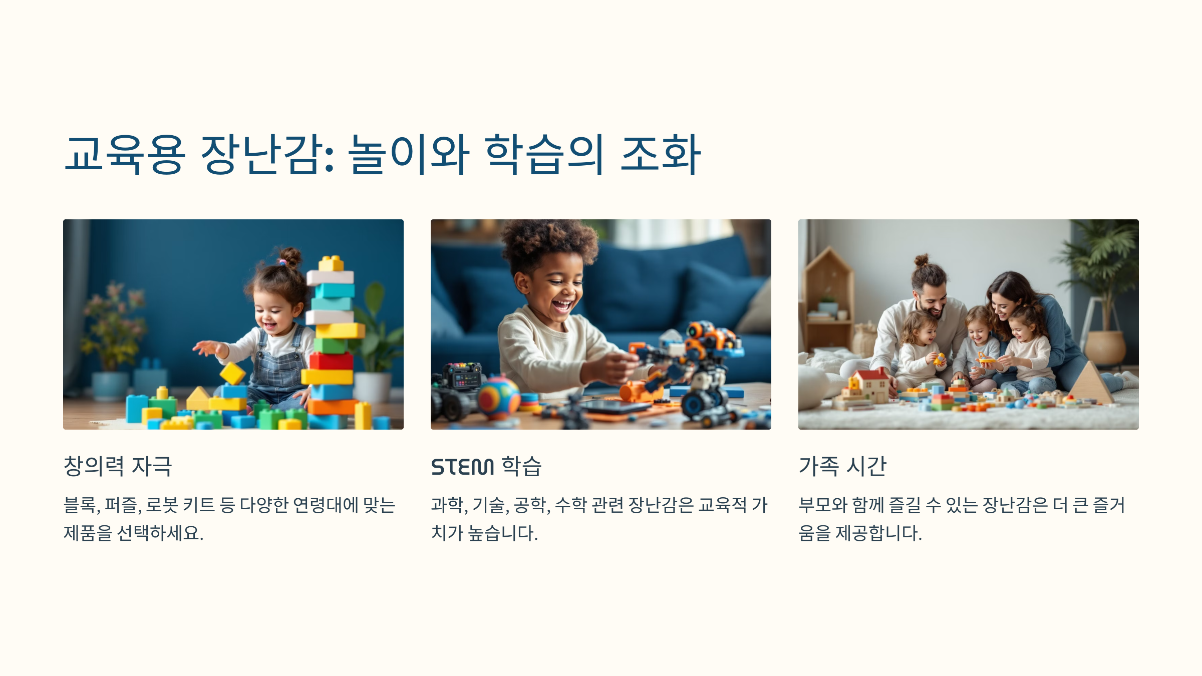 블록, 퍼즐, 혹은 로봇 키트 등 다양한 연령대에 맞는 제품을 선택하세요.