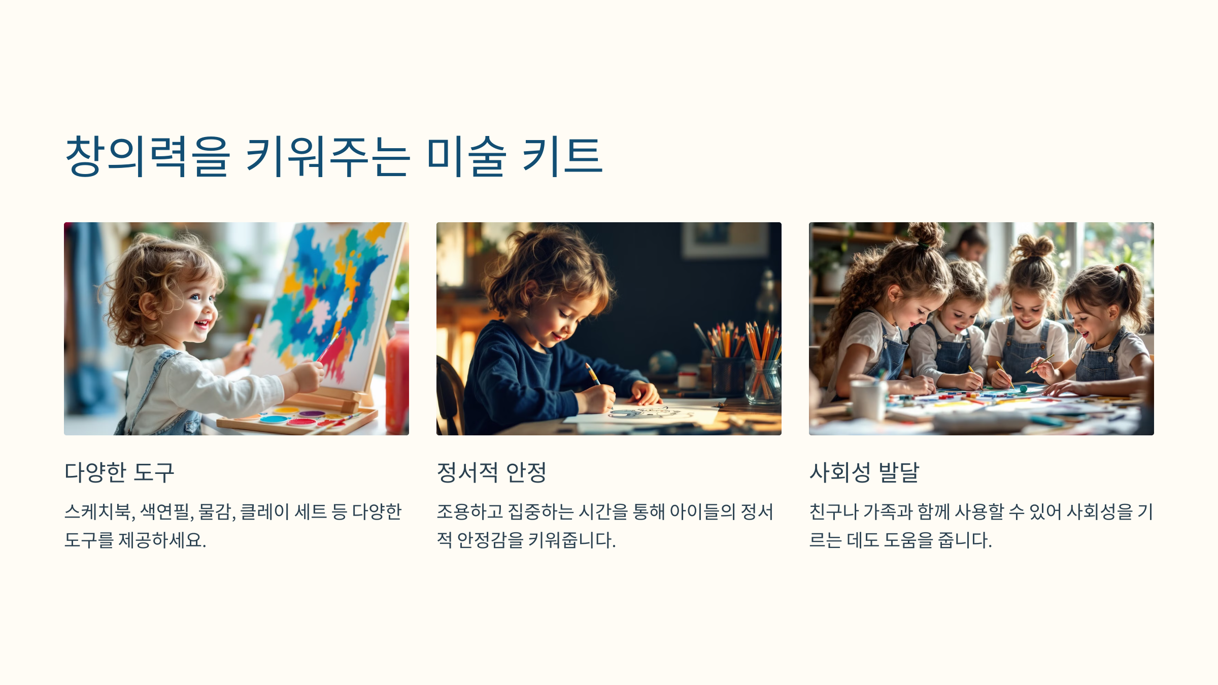 미술 키트는 조용하고 집중하는 시간을 통해 아이들의 정서적 안정감을 키워줍니다.