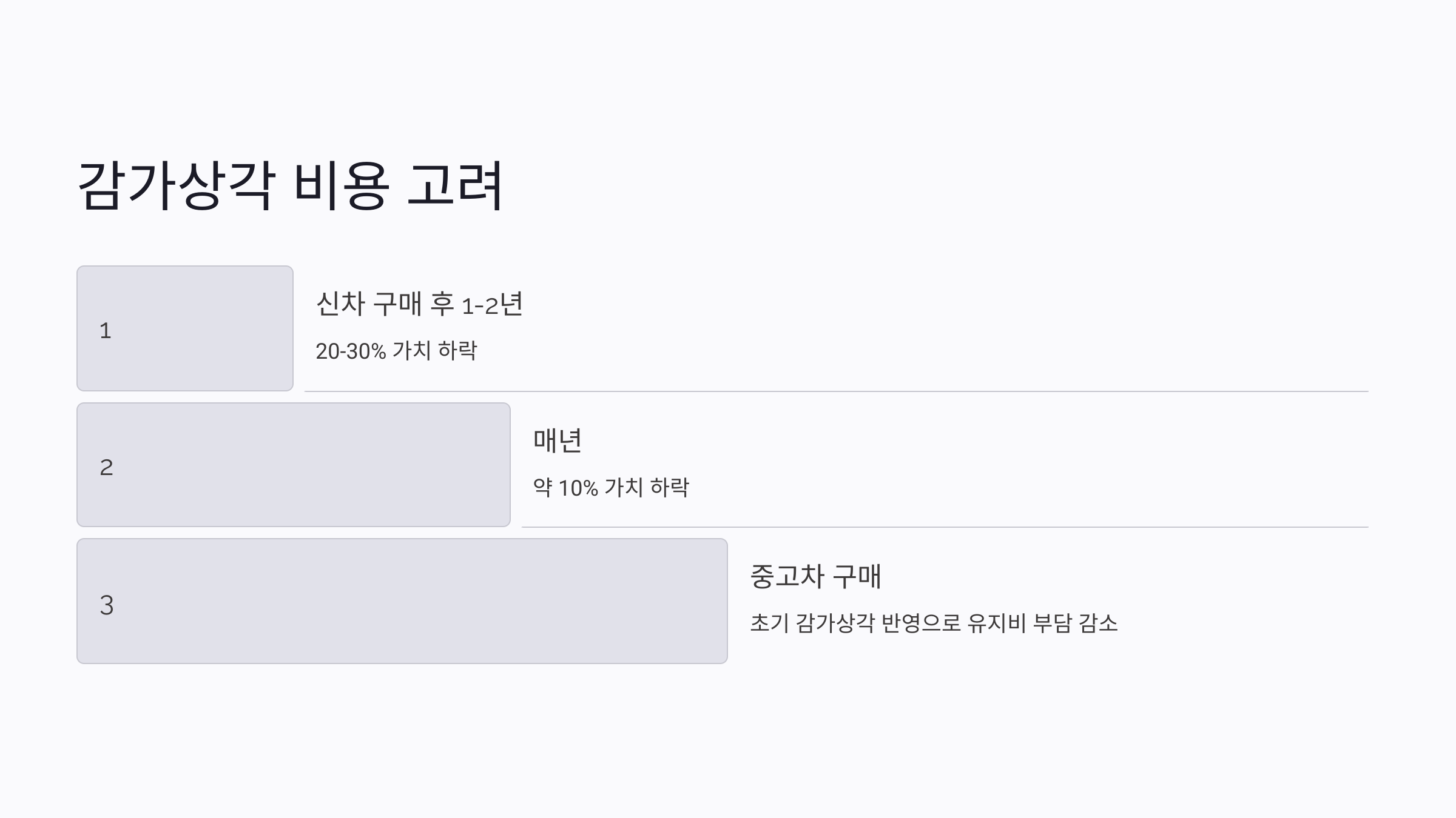 감가상각 비용을 줄이려면 신차보다는 연식이 2~3년 된 중고차를 구매하는 것이 좋아요. 중고차는 초기 감가상각이 이미 반영된 상태이기 때문에, 상대적으로 가치 하락 폭이 적고 유지비 부담도 줄어들어요.