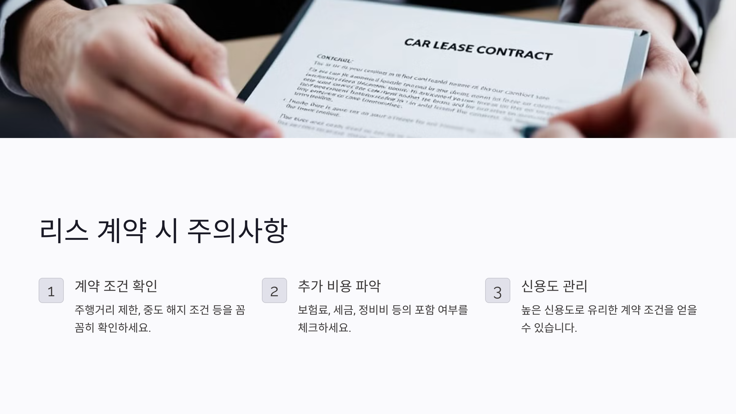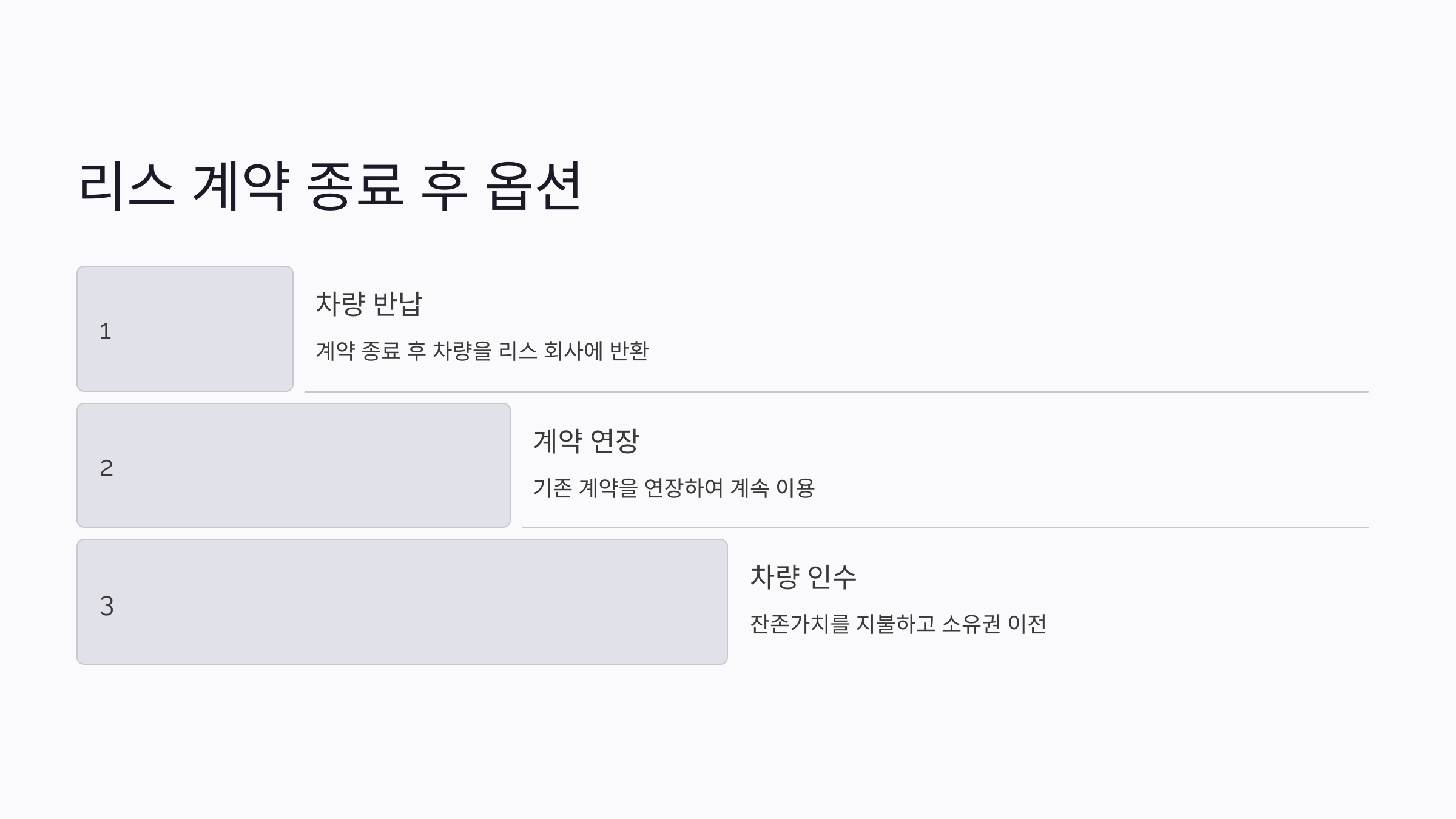 - 계약 종료 후 차량 반납이 기본이며, 인수 옵션을 선택할 수도 있어요.