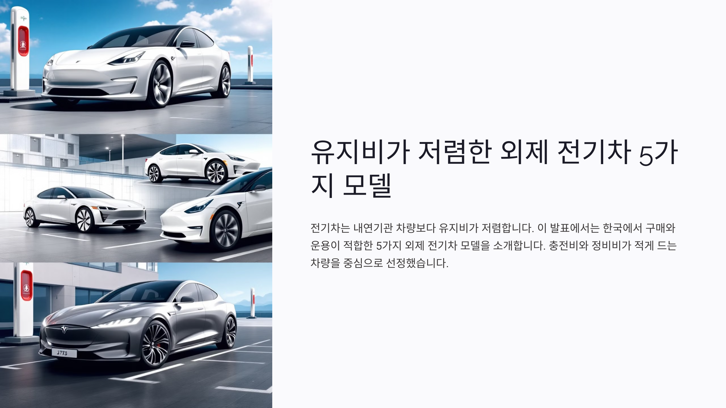 전기차는 기존 내연기관 차량보다 유지비가 저렴한 경우가 많아요. 이번 글에서는 외제 전기차 모델 중에서도 한국에서 구매 및 운용이 적합한 5가지 모델을 추천할게요. 특히 충전비와 정비비가 적게 드는 차량을 중심으로 선정했어요.