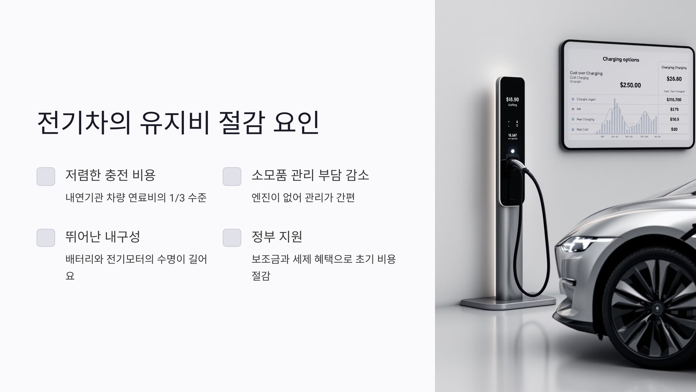 A1. 전기차는 연료비가 내연기관 차량의 약 1/3 수준이며, 오일 교환 같은 소모품 관리가 필요 없어 유지비가 더 저렴해요.