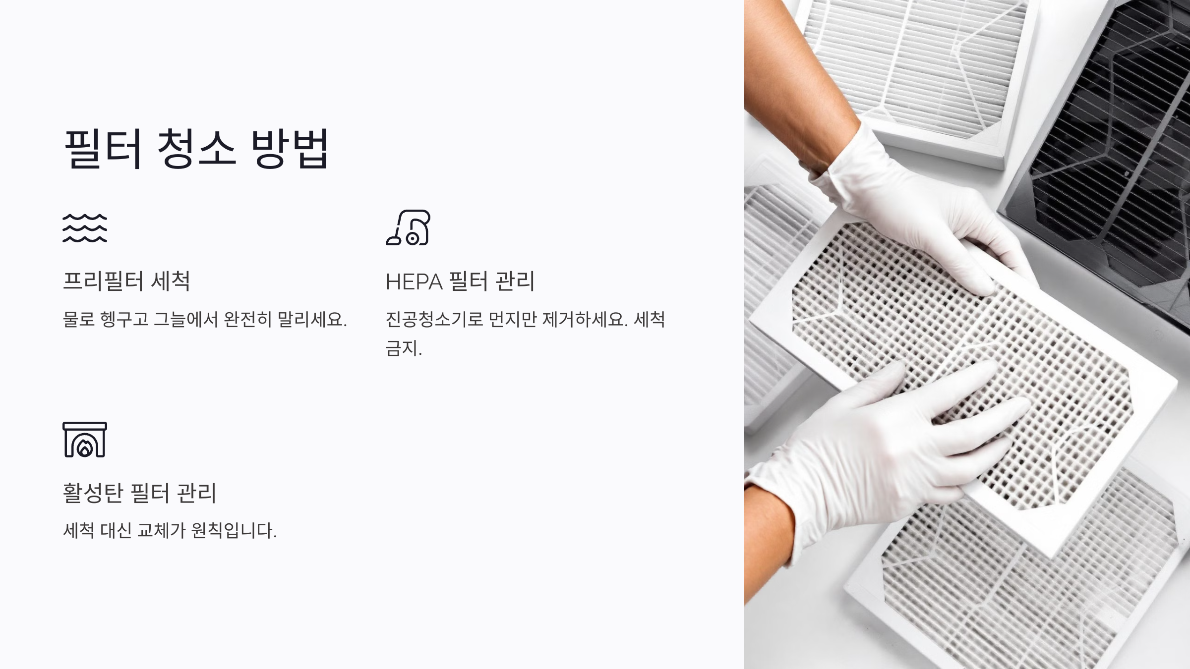 1. 물에 적합한 필터만 세척: HEPA 필터나 활성탄 필터는 세척이 불가능하니, 프리필터만 물 세척을 해야 해요. 잘못된 세척은 필터 성능을 손상시킬 수 있어요.