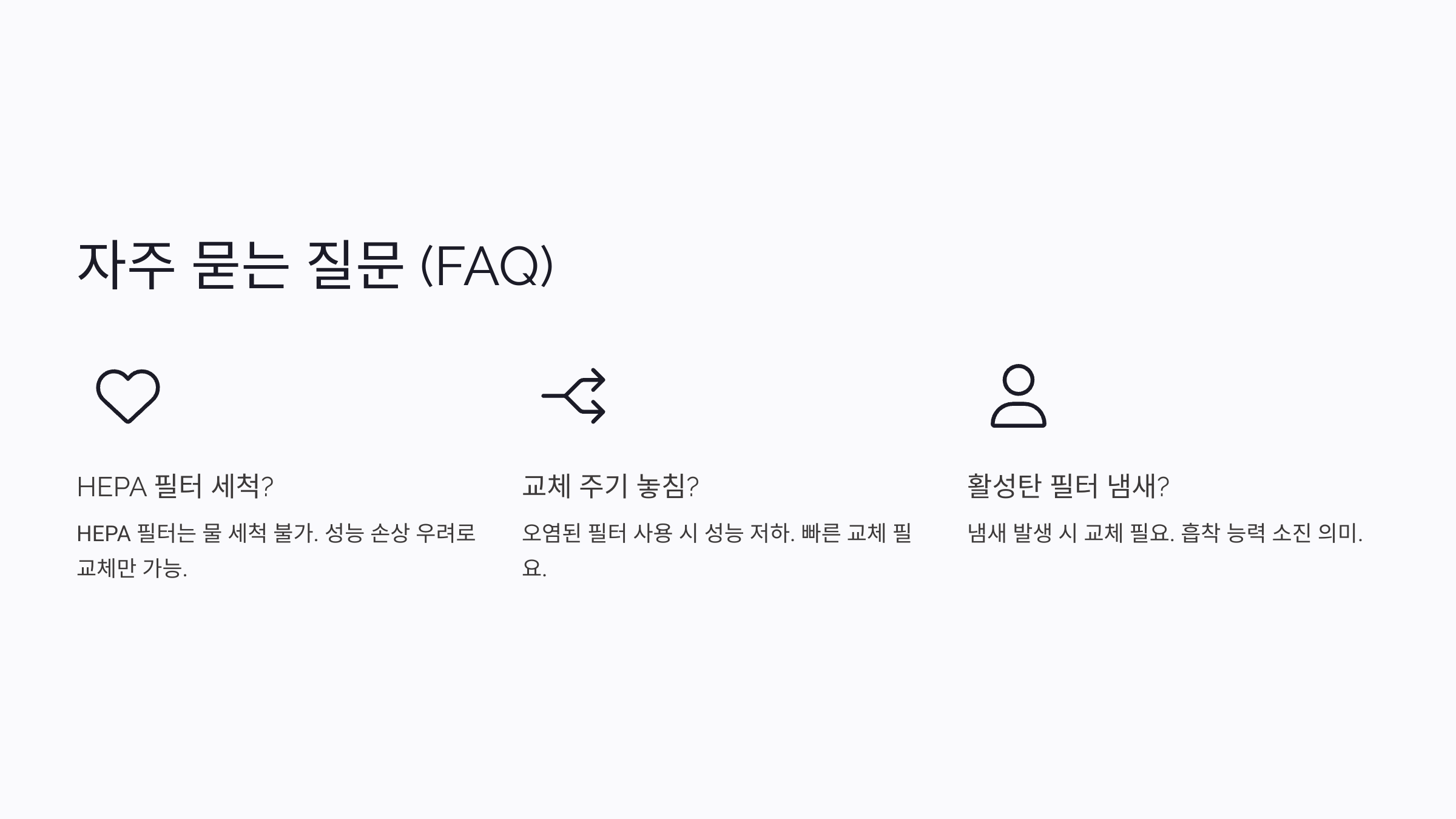 A1. HEPA 필터는 물 세척이 불가능해요. 물에 닿으면 필터 성능이 손상되므로 교체가 필요할 때만 교체하세요.